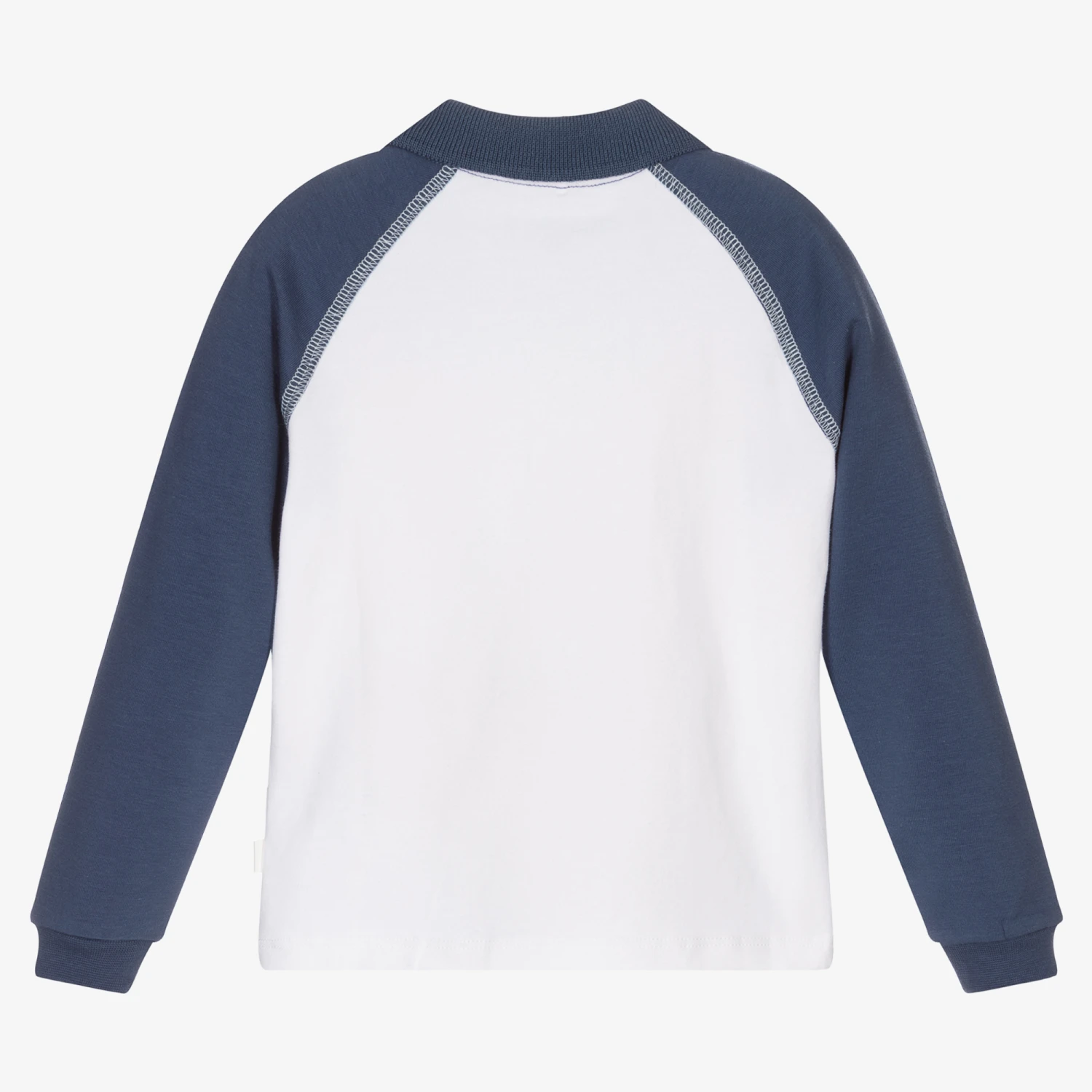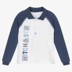 White and dark blue polo shirt for boys by Mitch & Son, made in soft cotton jersey. It has a blue logo motif on the front in print, embroidery and bouclé, with white overstitch detail on the raglan seams and branded button fastenings.