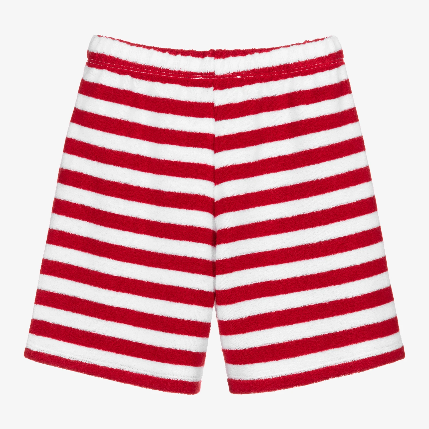 Red and white striped shorts for boys and girls by Mitty James, exclusive to Childrensalon and just right for the beach or poolside. They are made in soft, absorbent cotton towelling with a smooth reverse side and have a comfortable elasticated waistband with a faux drawstring tie. There is navy blue logo embroidery on one leg.