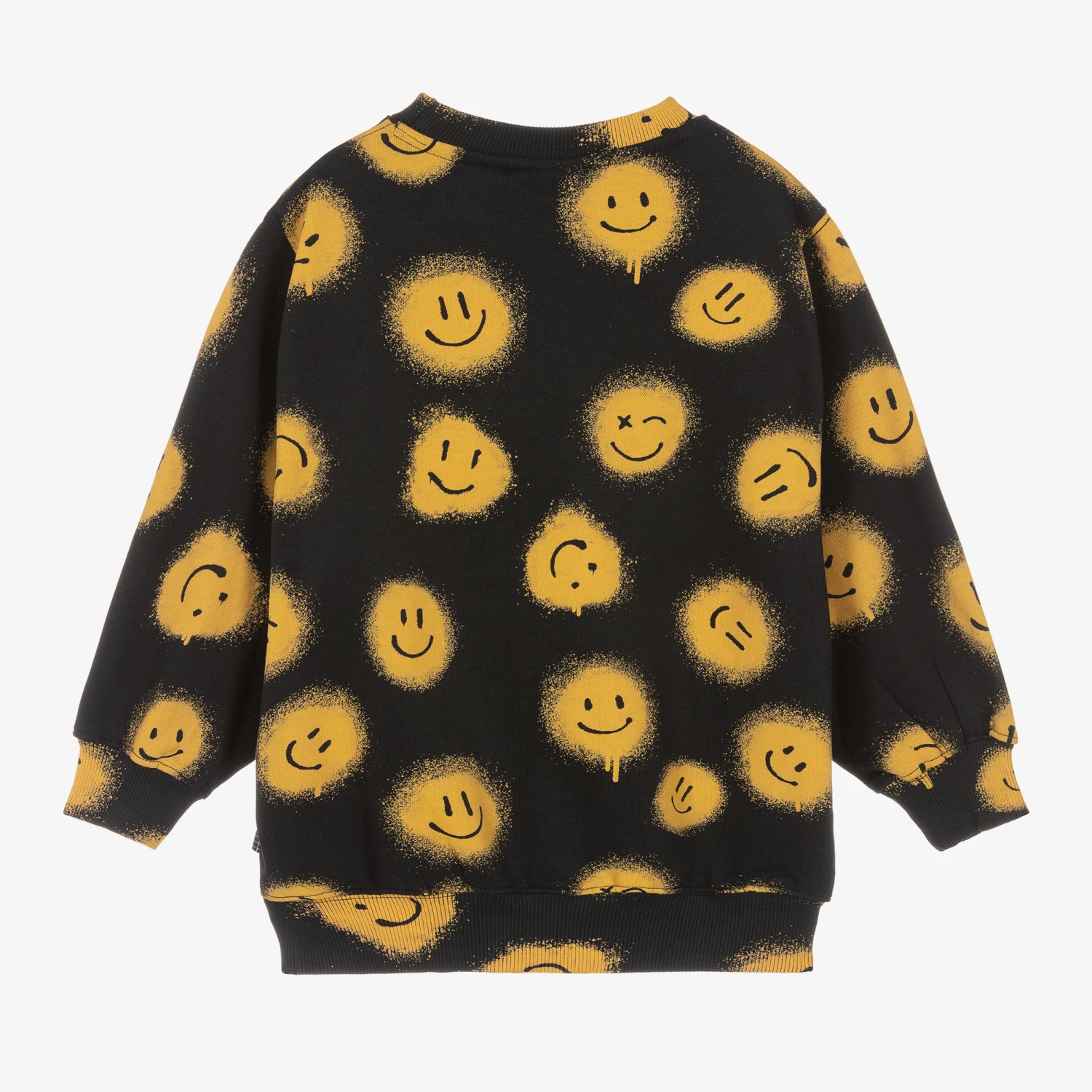 Boys and girls will stand out in this black, cotton jersey sweatshirt by Molo, printed with fun, yellow happy faces. Oversized and comfortable to wear, it has a crew neckline with narrow ribbed trims.