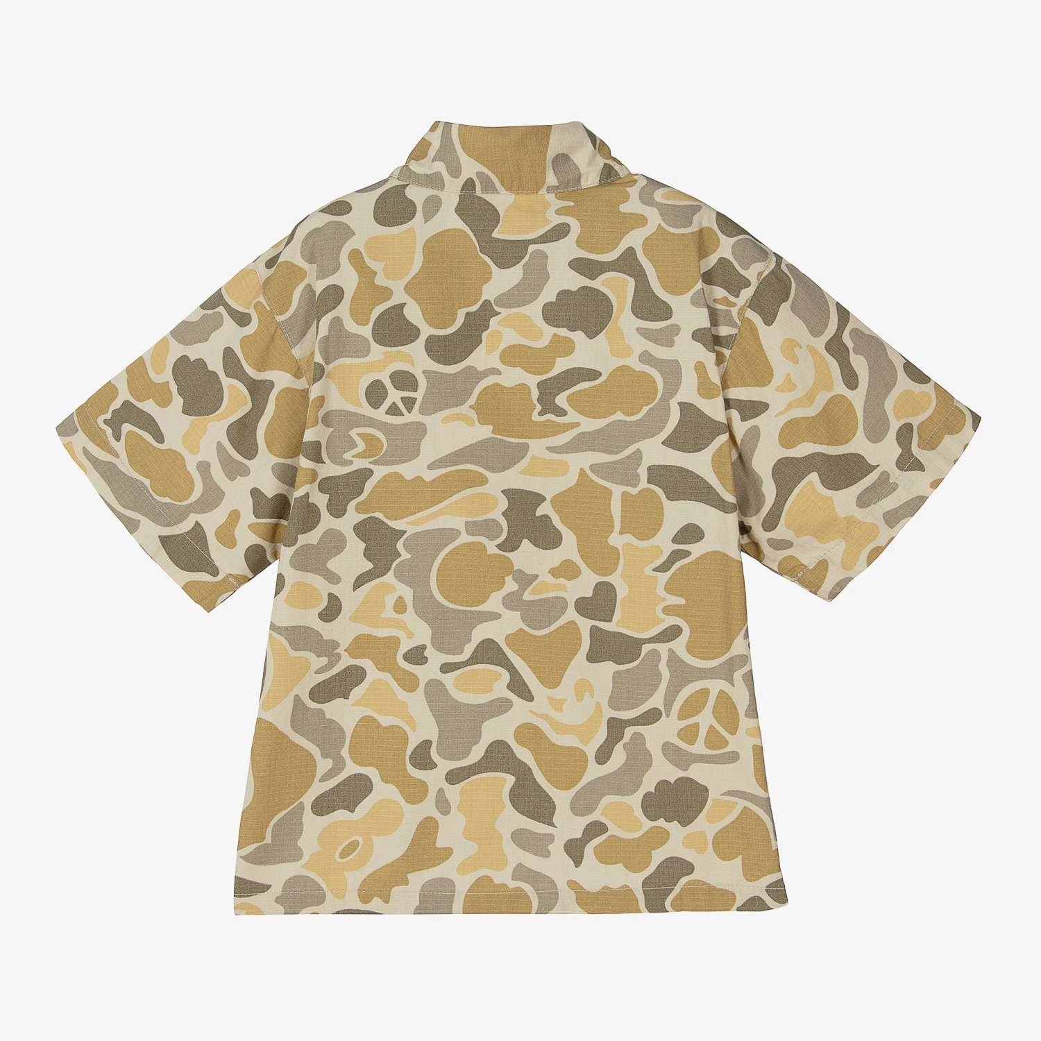 A patterned beige shirt for boys by Danish brand Molo, made in a soft and gently textured cotton ripstop. In an abstract camouflage print, this short-sleeved shirt is accented with a unique pattern of sand formations. It has a pointed collar and button fastenings on the front for a classic look.