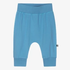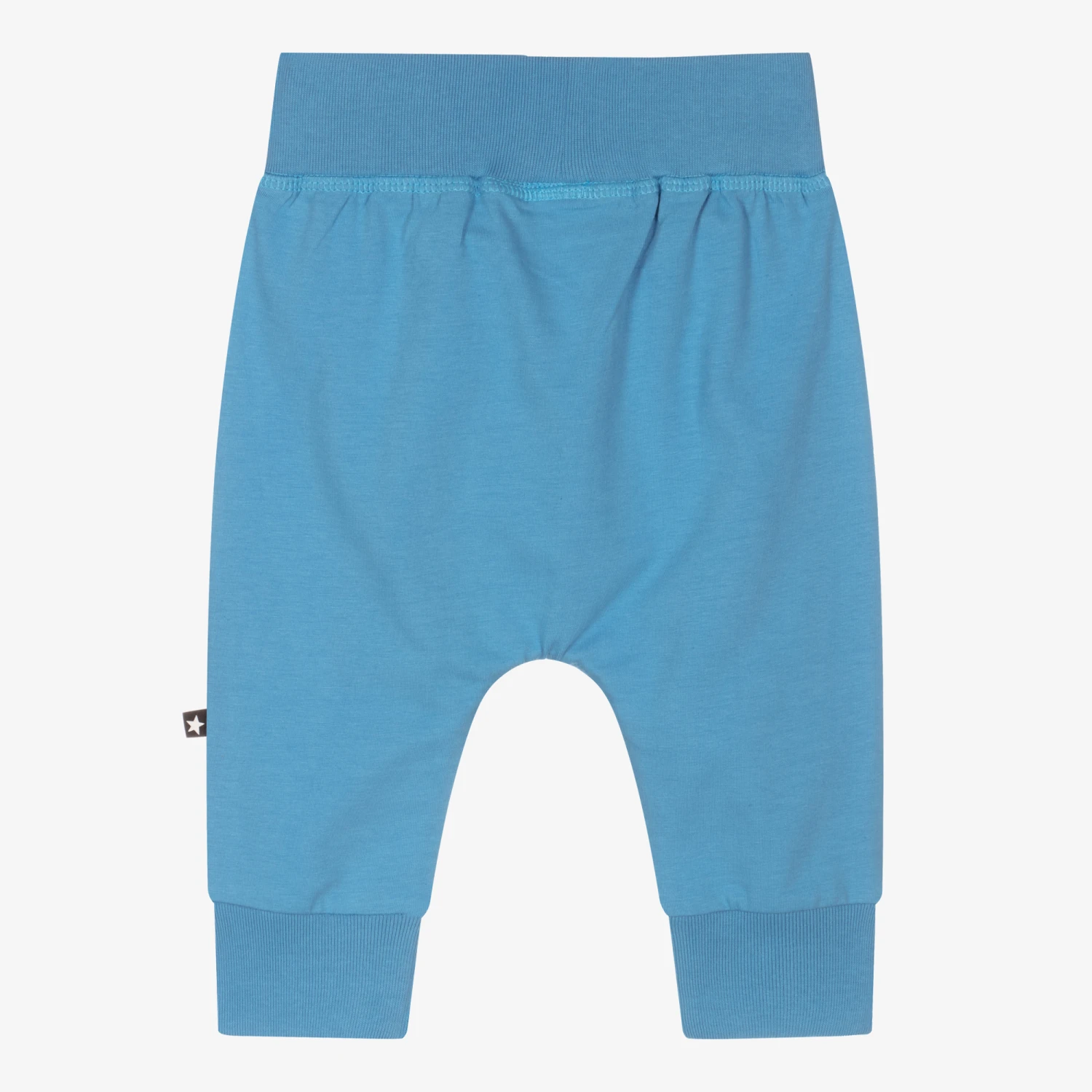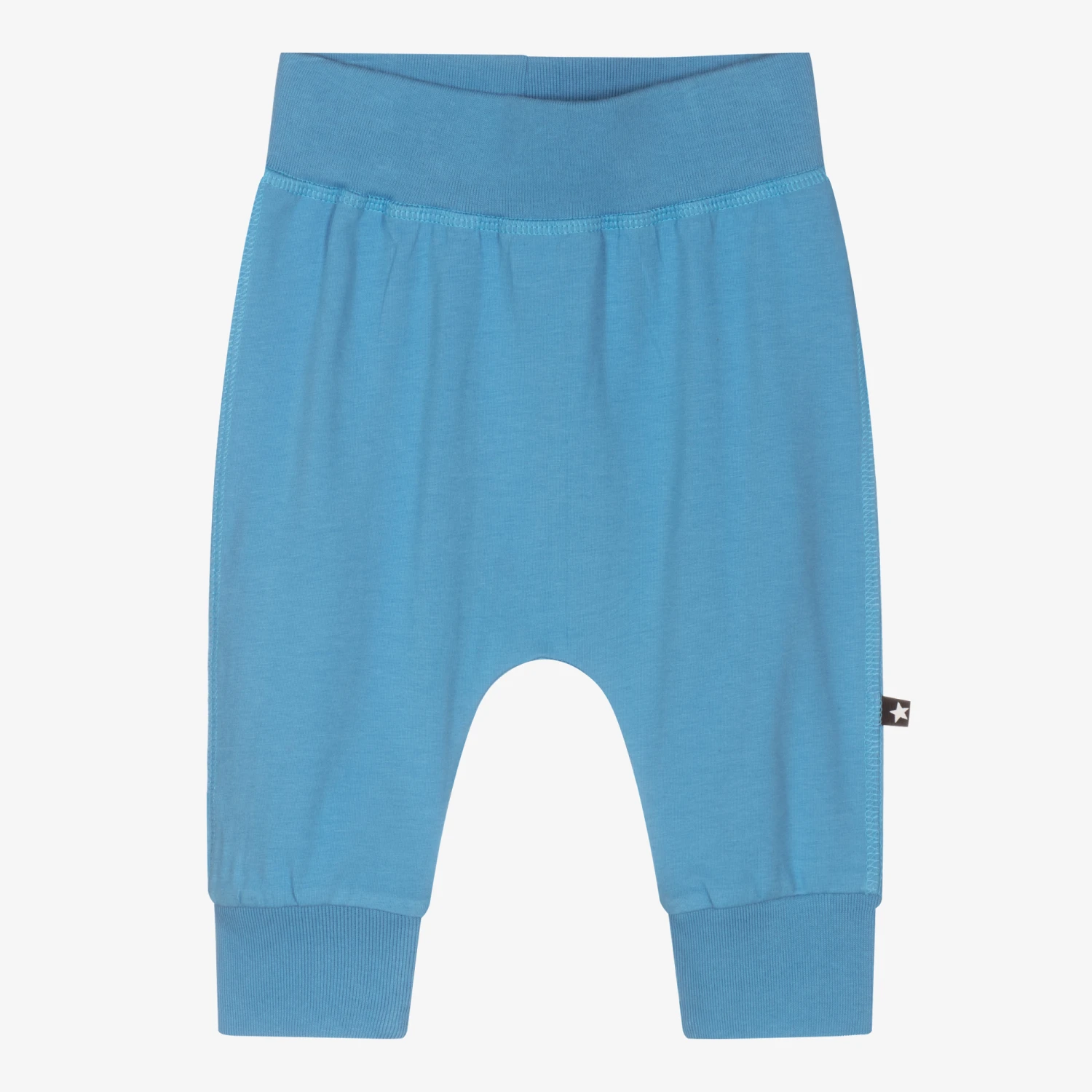 Light blue joggers for little boys by Molo, made in soft cotton jersey. These lightweight trousers have ribbed trims and a comfortable elasticated waistband.