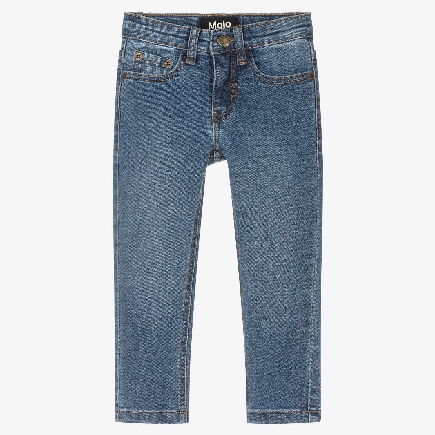 Blue denim jeans for boys by Danish brand Molo, made in a soft and stretchy organic cotton with recycled materials. Classic and cool, this slim-fit style has five-pocket styling, a zip and popper fastening, and an adjustable waistband.