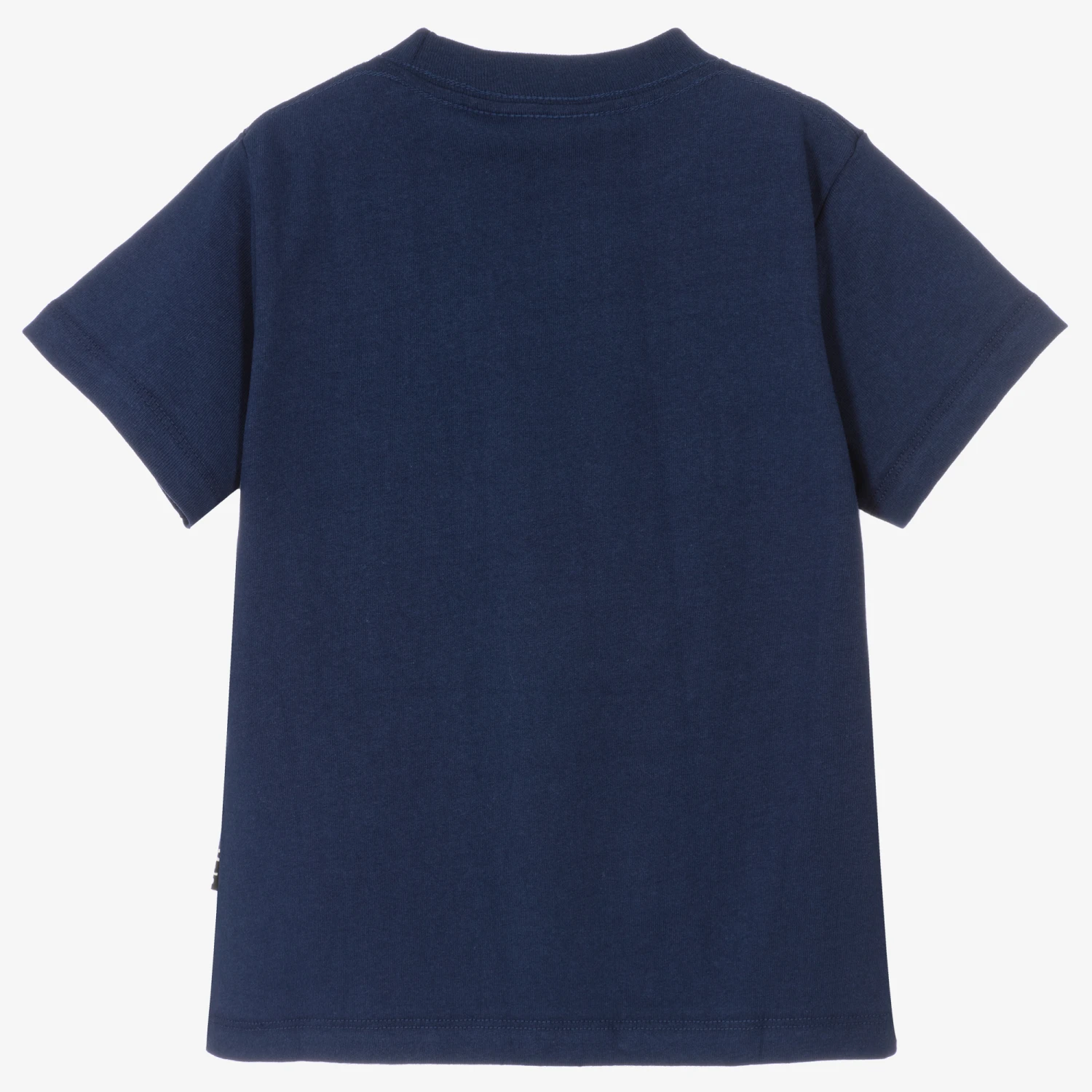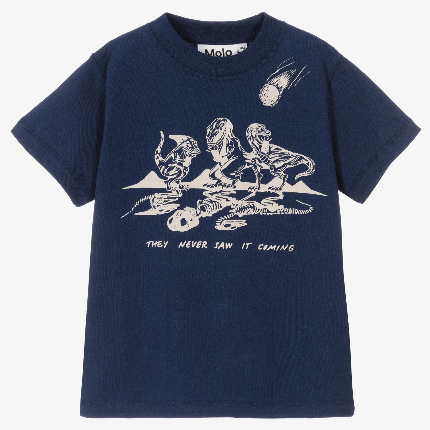 Deep blue cotton T-shirt for boys by Danish brand Molo, with a quirky pale grey print of dinosaurs and a meteor on the front. With a logo tab on one side seam, it is made in comfortable jersey, so is ideal for relaxing in all day,