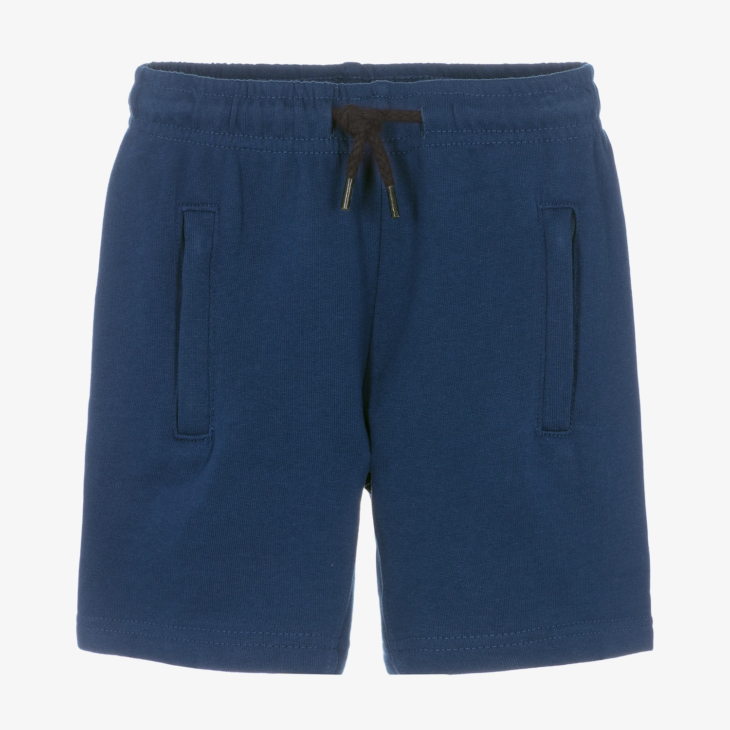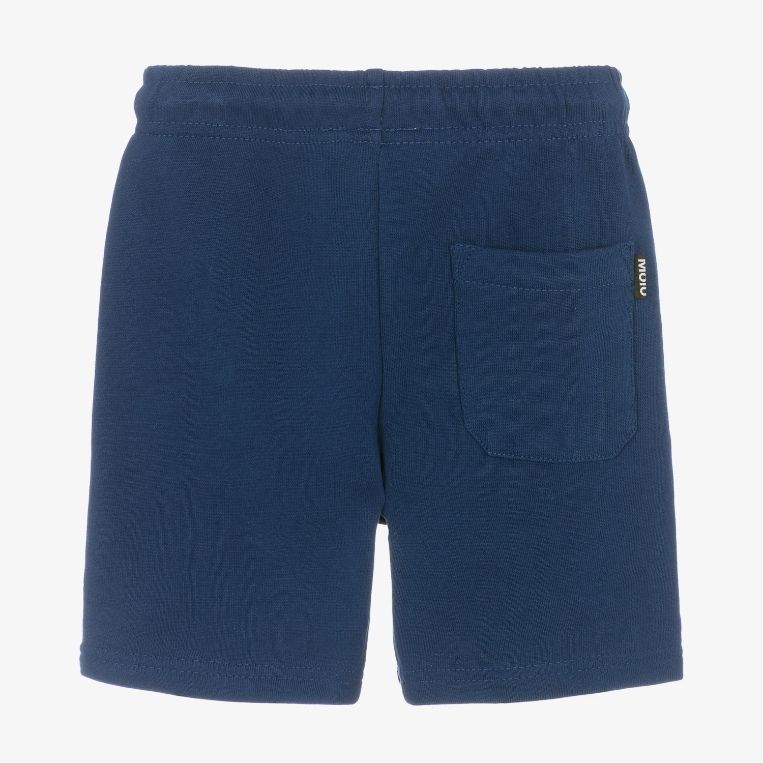 Navy blue shorts for boys by Molo, great for comfortable lounging. Made in soft organic cotton jersey, they have a black drawstring waist and useful zip pockets on the sides.