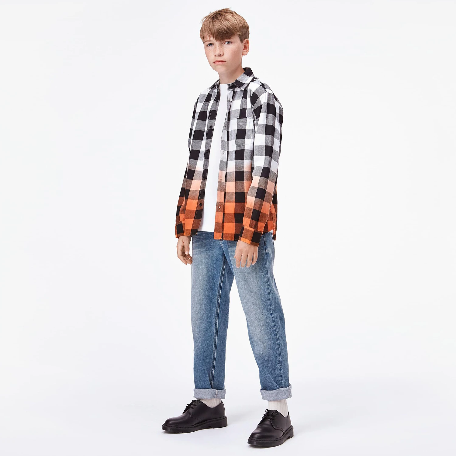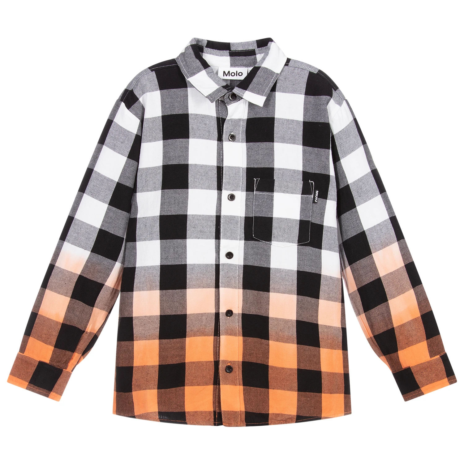 Black and white checked shirt for boys by Molo, made in soft, brushed cotton. It has an orange dip dyed effect at the bottom and on both sleeves.