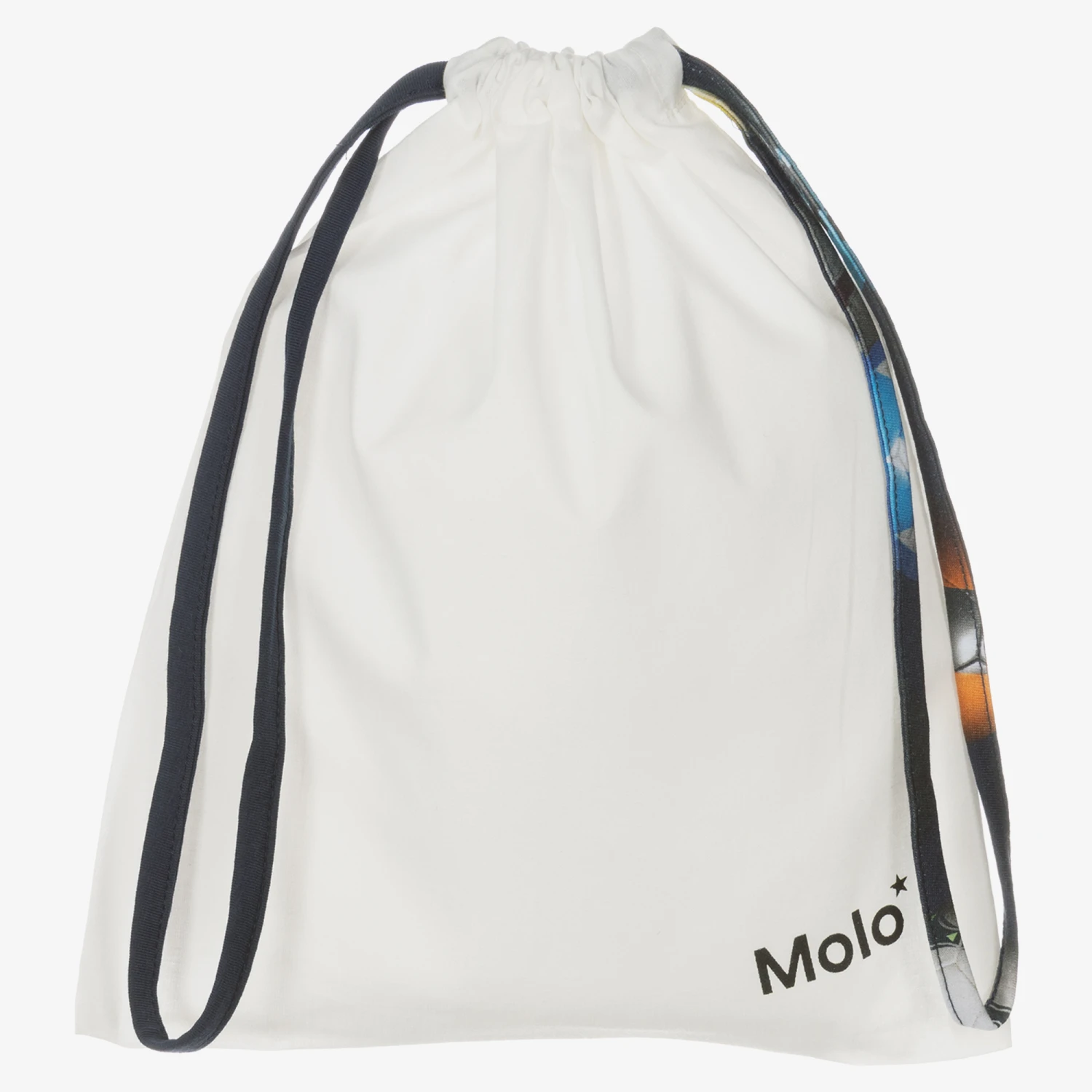 Two pack of organic cotton jersey boxer shorts for boys by Molo. One pair is navy blue and the other has a realistic print of different footballs, both have jacquard logo elasticated waistbands for a comfortable fit.