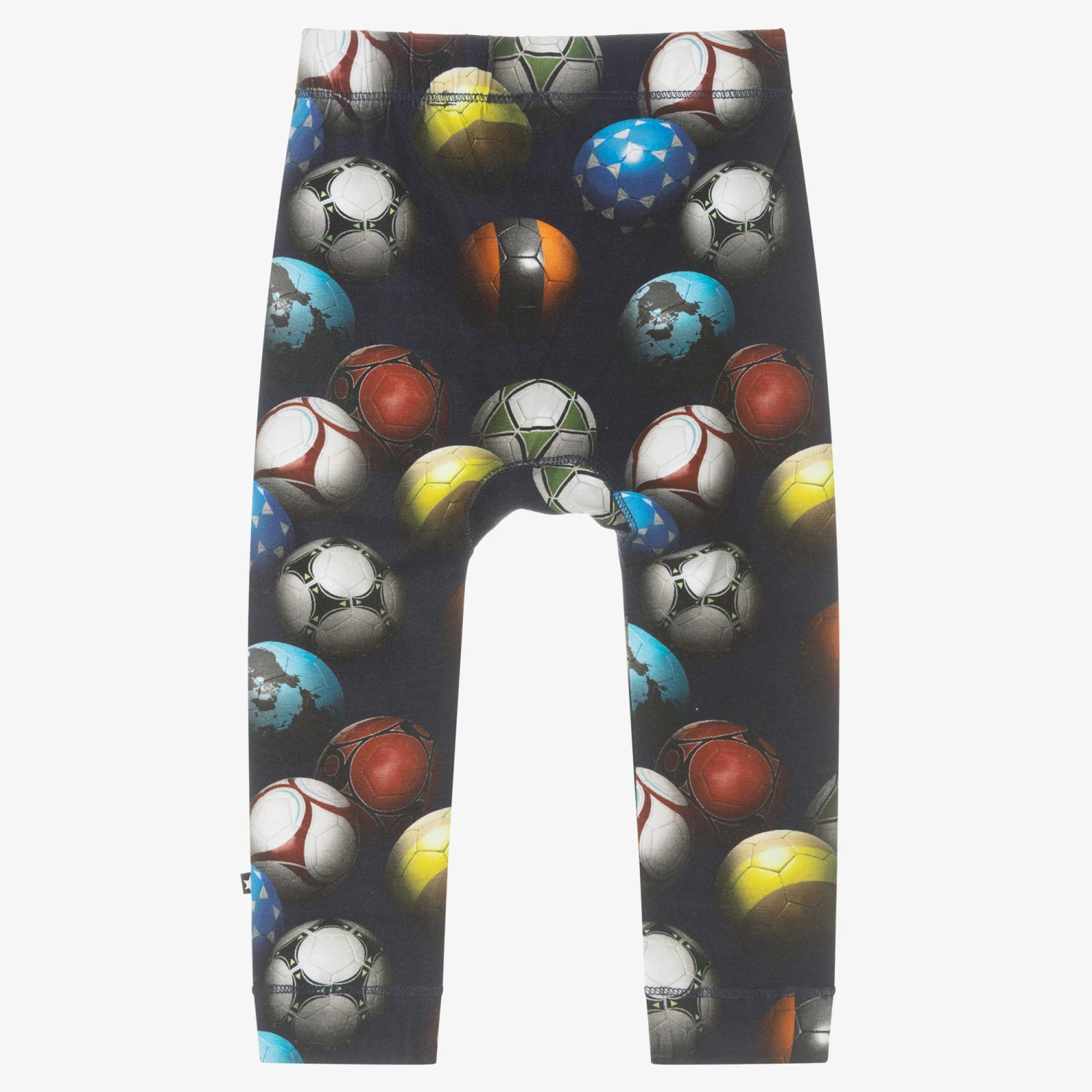 From Danish brand Molo, navy blue organic cotton trousers for little boys. Distinctive to the designer, these soft and stretchy jersey trousers are printed with football graphics in colourful shades, with a small logo tab just above the ankle. They have slim-fitting legs and an elasticated waistband for added comfort.