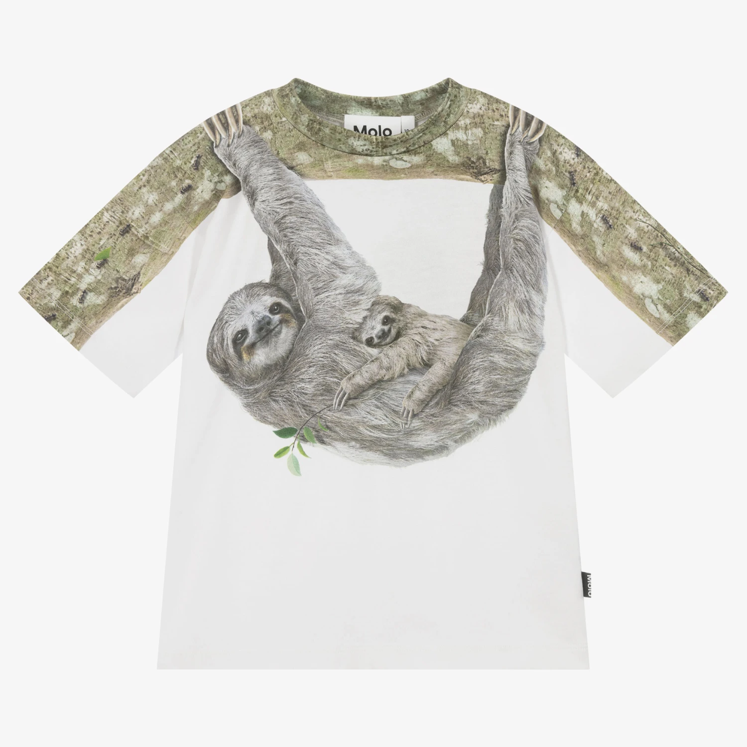 White T-shirt for boys by Molo, made in soft organic cotton jersey. Printed with a quirky hanging sloth on the front and back, it has a relaxed crew neckline for a casual look.