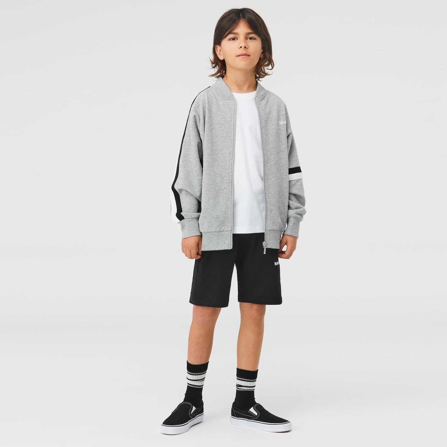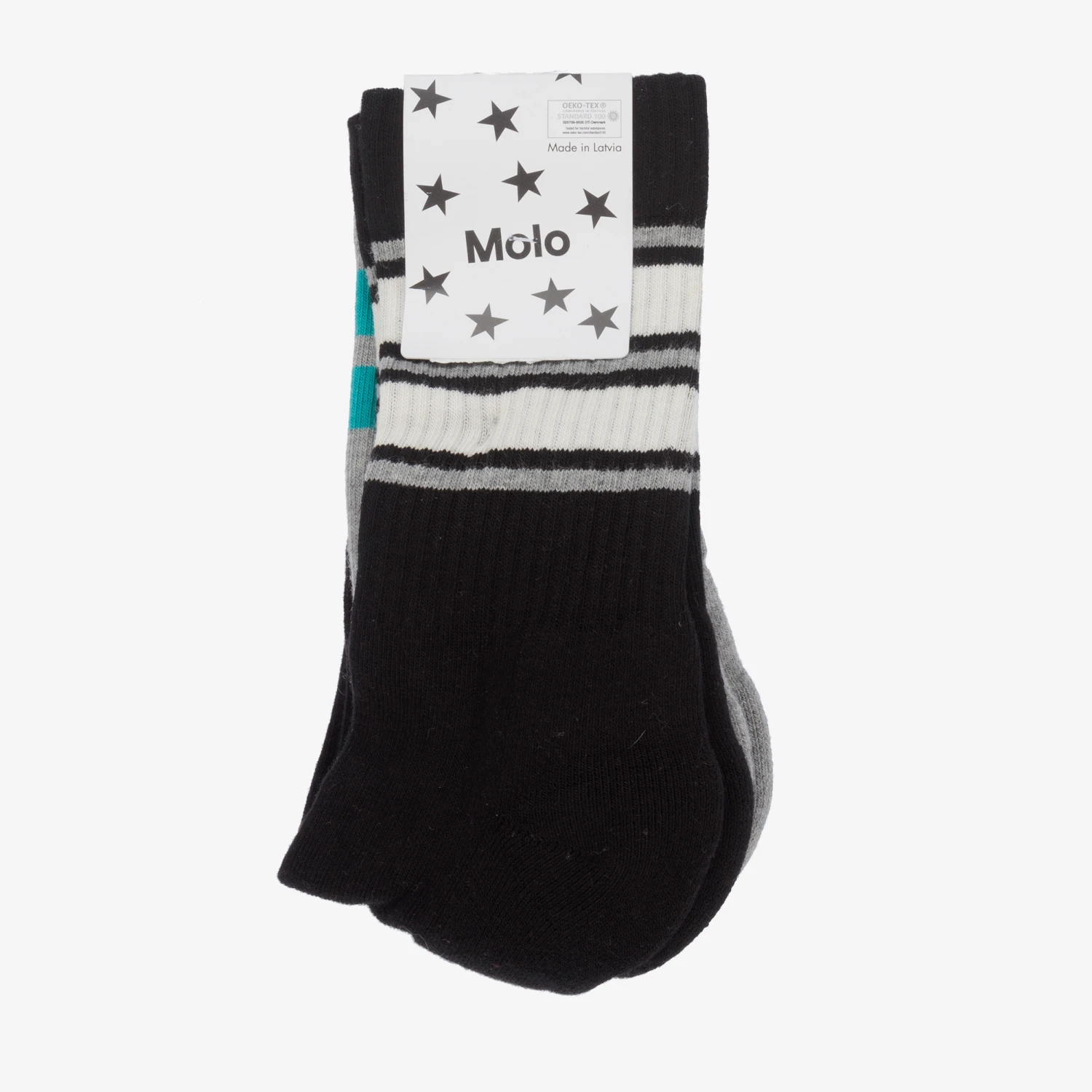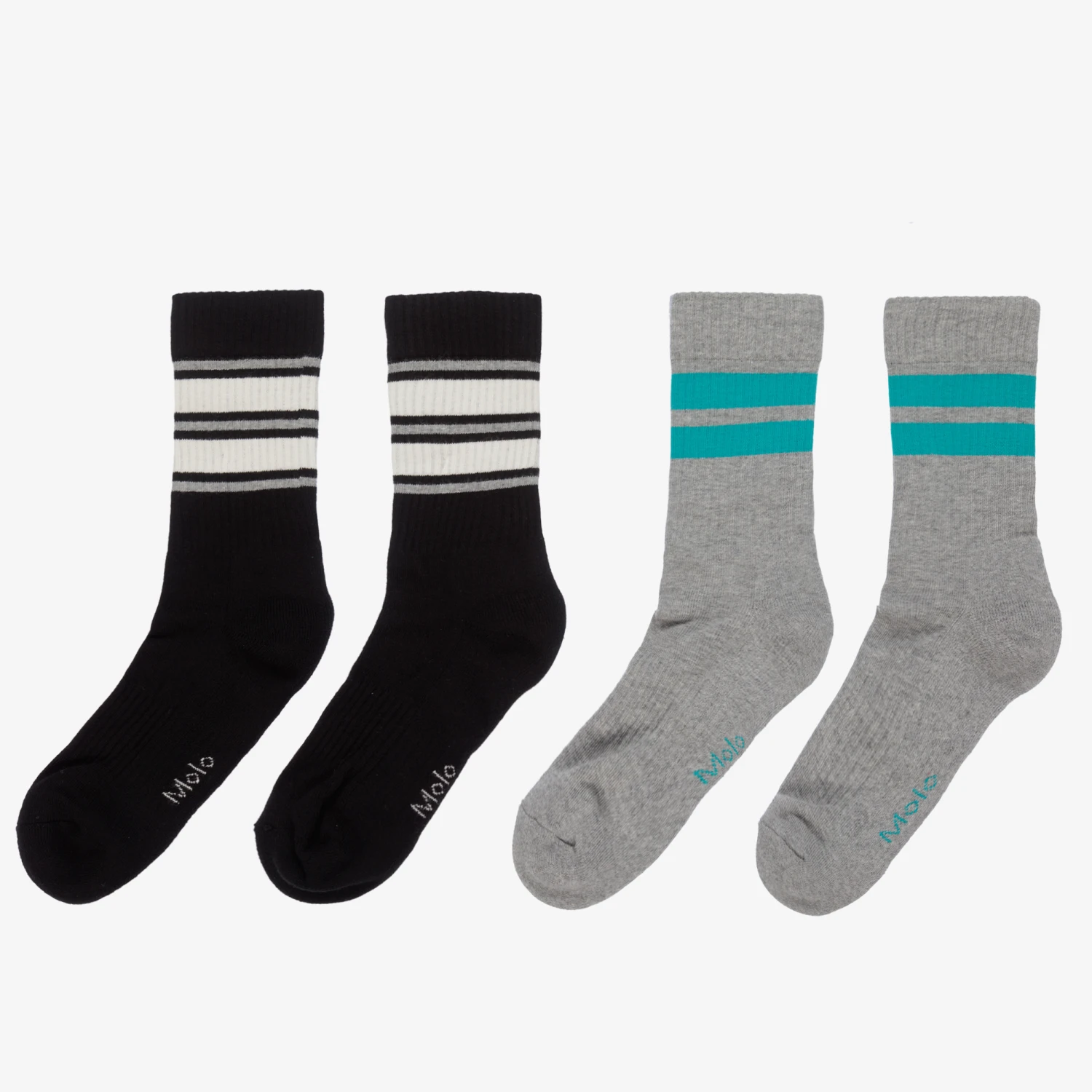Black and grey socks for boys, by Molo. Made from soft knitted cotton, the black pair has a white and grey stripe on the ankle, and the other grey pair has a turquoise blue stripe around the ankle.