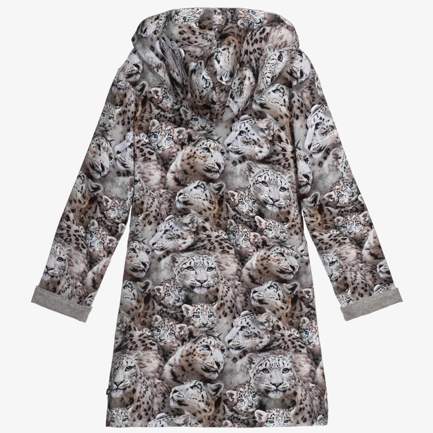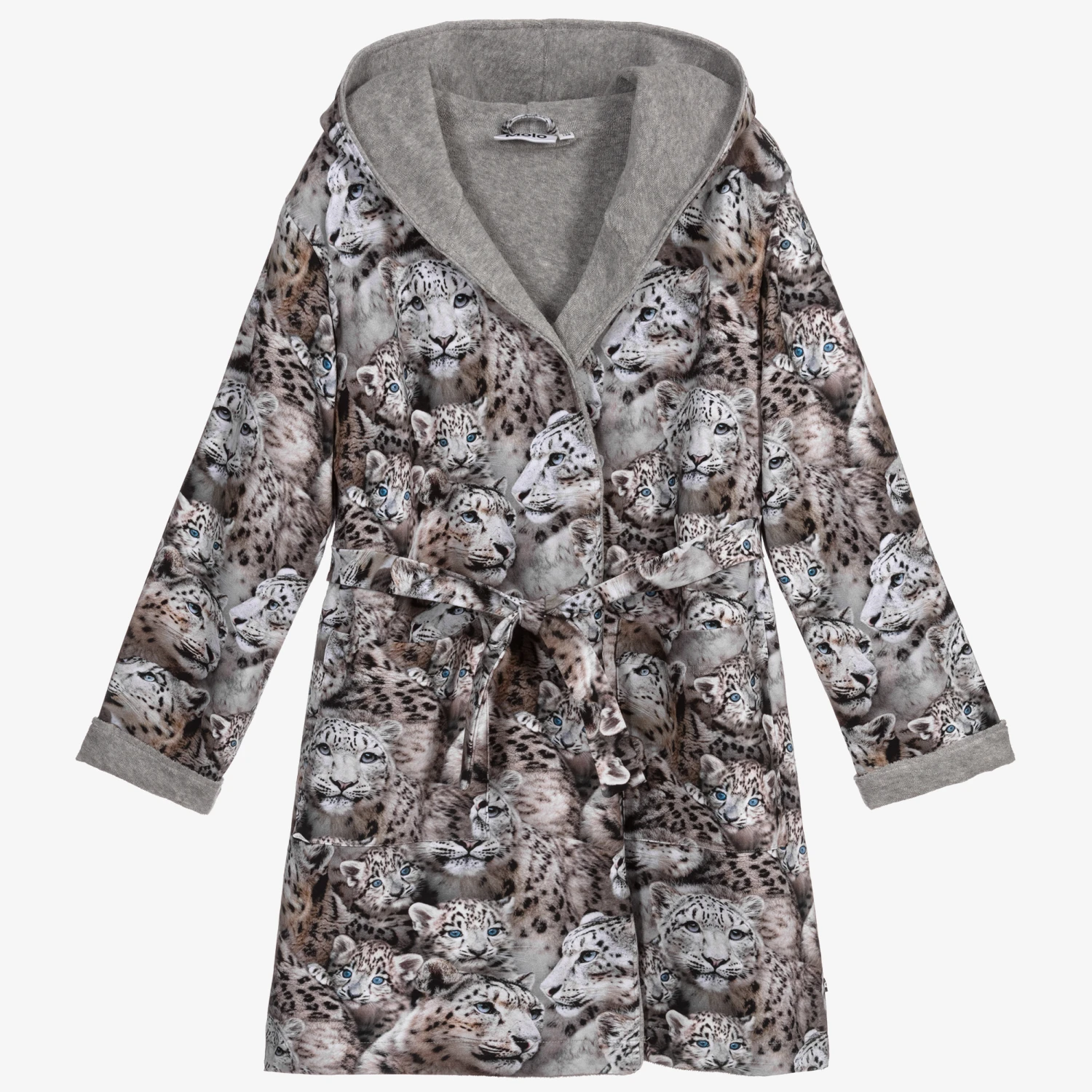 Boys grey hooded bathrobe by Molo, with a winter leopards print. Cosy and comfortable, it is made in organic cotton jersey and lined with soft grey towelling. There are two patch pockets on the front, and an elasticated waistband with a tie fastening.