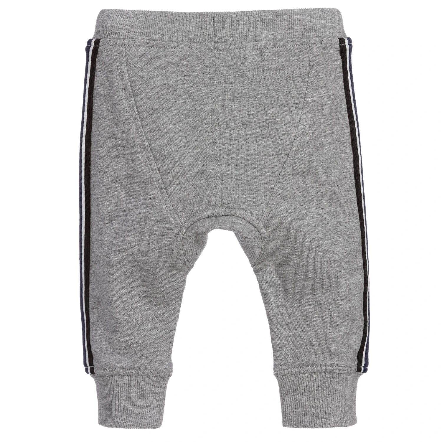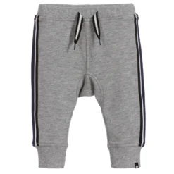 Little boys grey joggers by Molo, made in soft, organic cotton jersey. They have blue, black and white stripes on the side seams and a matching drawstring.