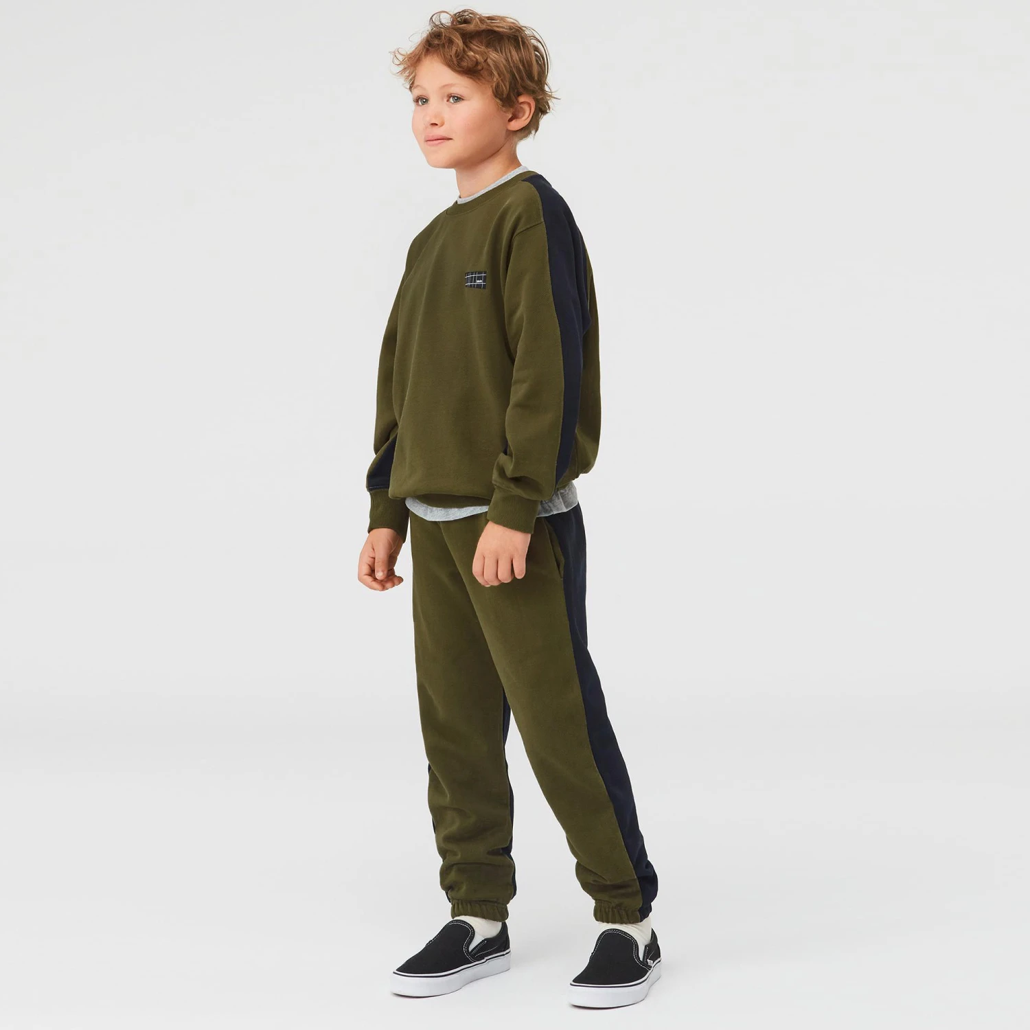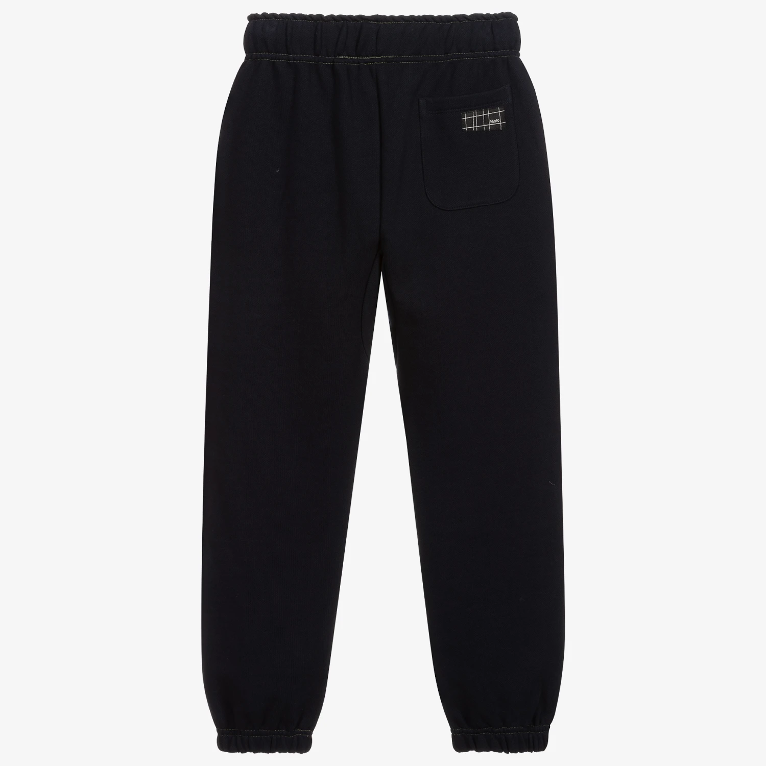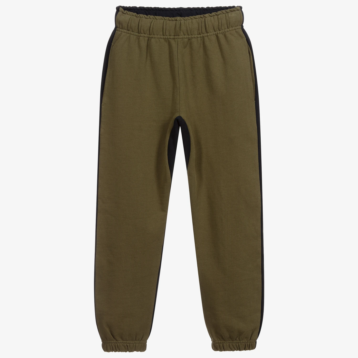 Khaki green and navy blue joggers for boys by Molo, made in soft organic cotton sweatshirt jersey. They have front and back pockets, an internal drawstring waist and a black and white logo patch on the back pocket.