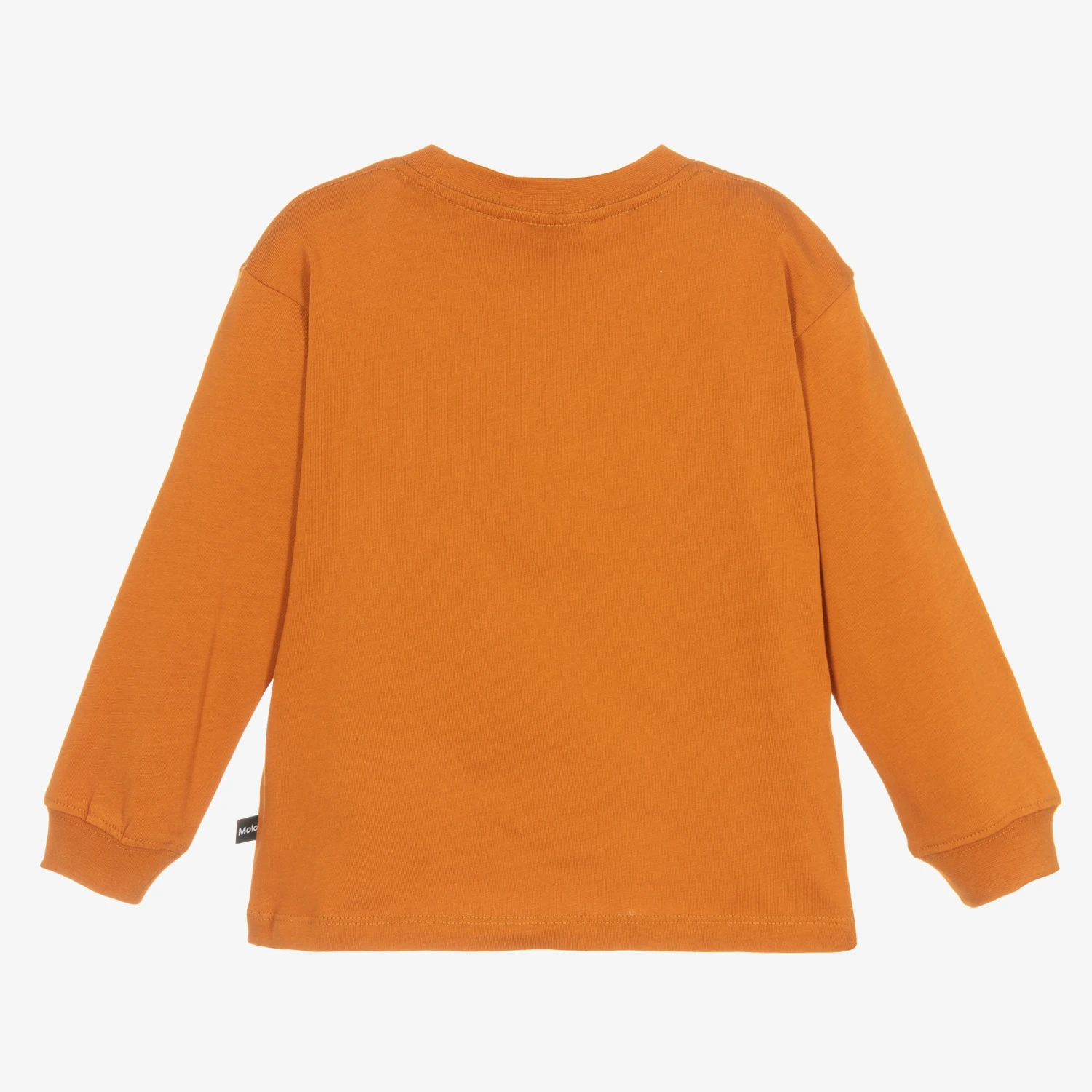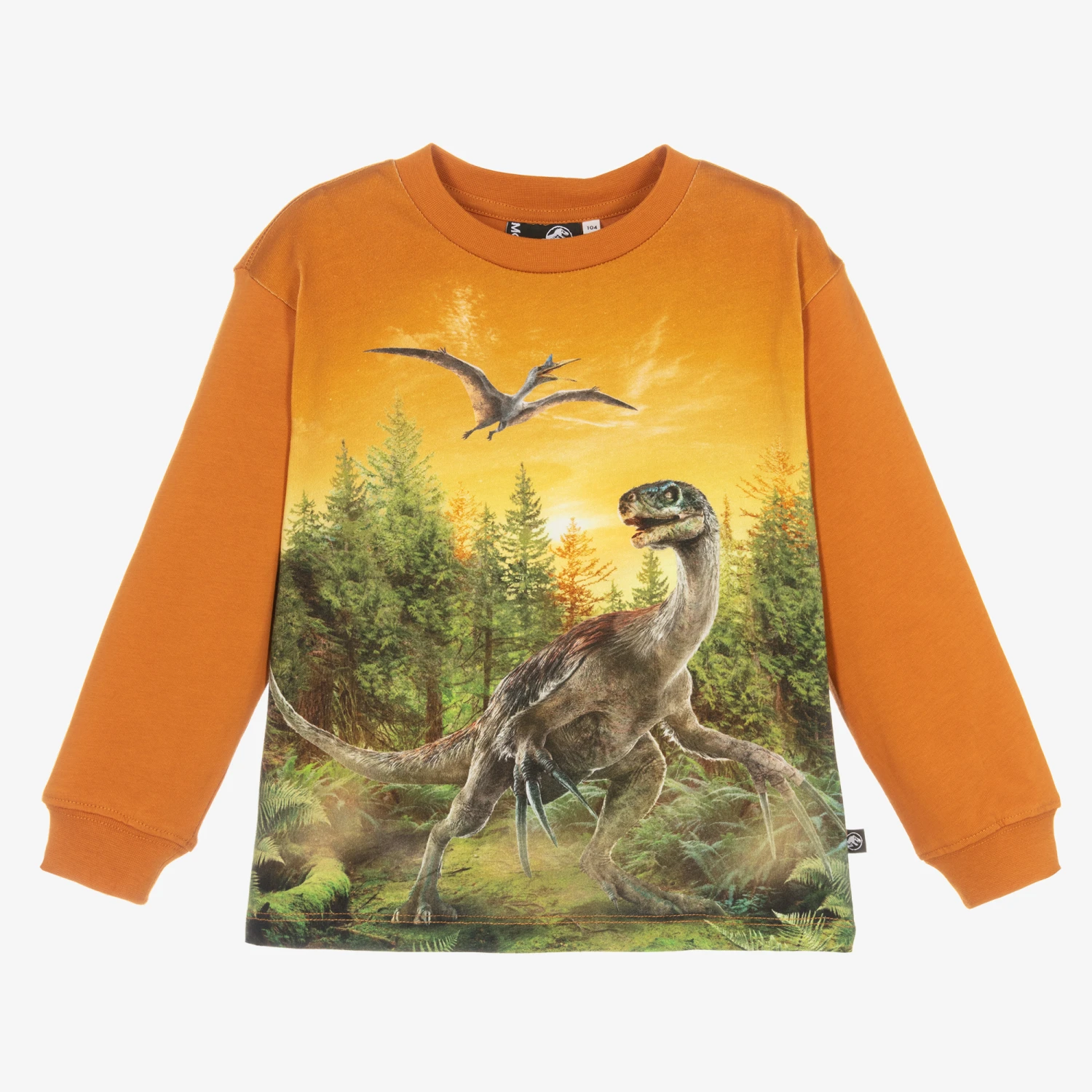 Burnt orange cotton top for boys and girls by Molo, with a print of two dinosaurs in a green forest. As part of the brand’s Jurassic World collaboration, this casual top is made with super soft organic cotton jersey for a cool and comfortable fit.