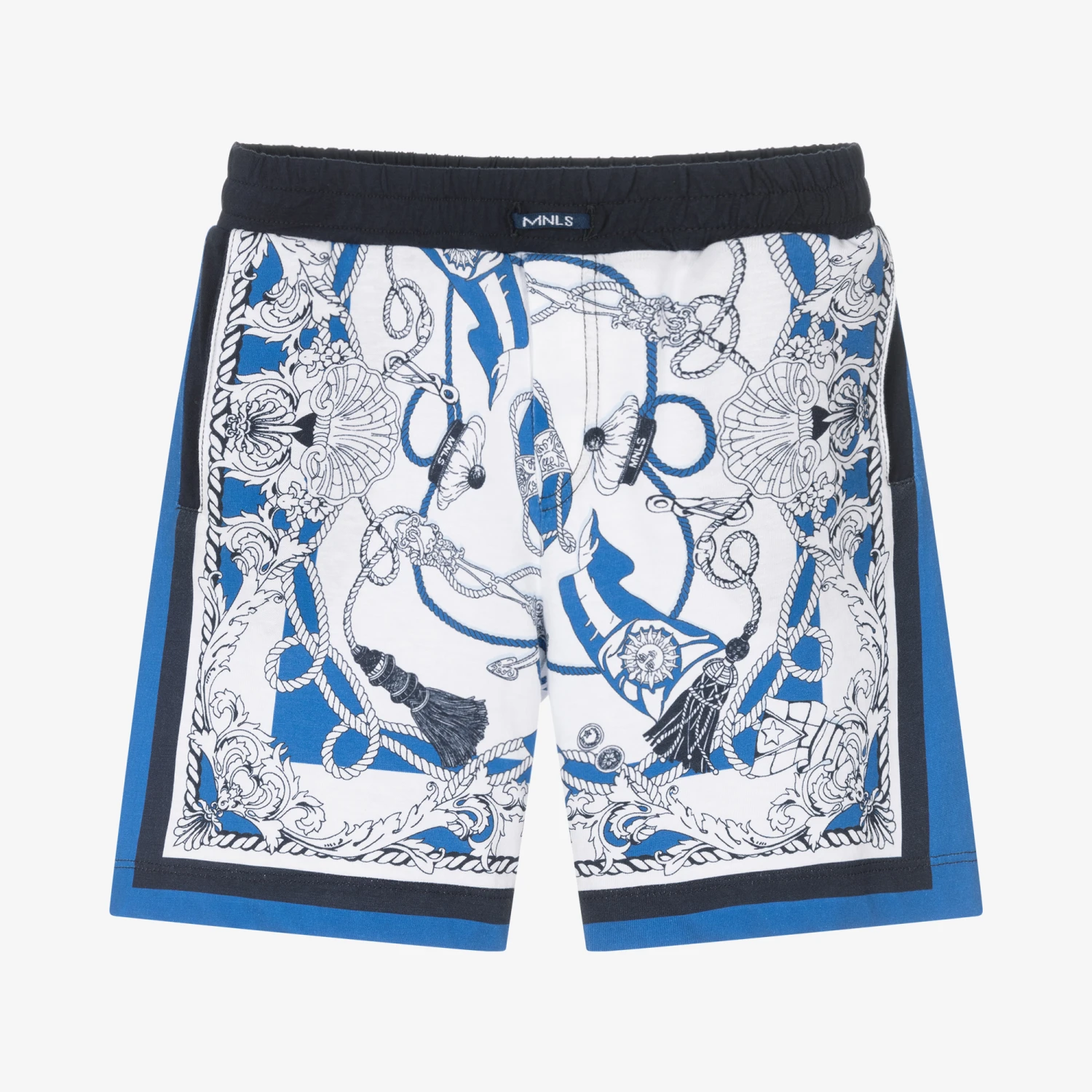 Casual white and blue shorts for boys from Monnalisa, made in soft cotton jersey. Taking style cues from classic Italian design, they have a renaissance inspired rope print all-over. There are tonal blue trims and a plain navy blue elasticated waistband.