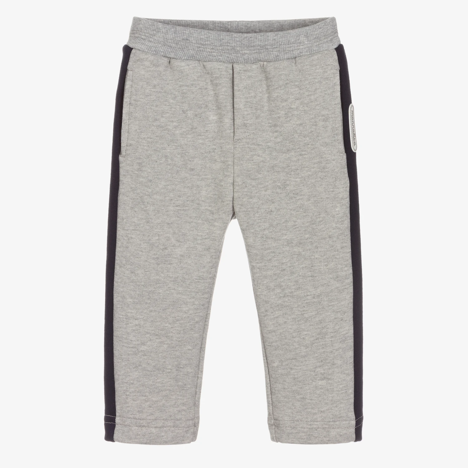 Comfortable grey marl joggers for little boys from Monnalisa, with navy blue side stripes and a rubberised logo patch. Made in soft cotton sweatshirt jersey with a fleecy feel inside, they have an elasticated waistband, useful side pockets and a faux pocket detail on the back.
