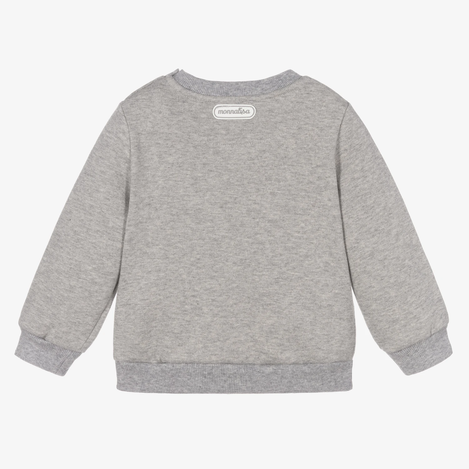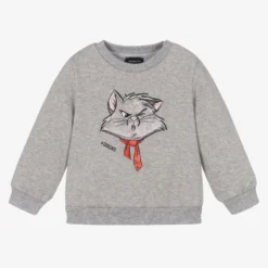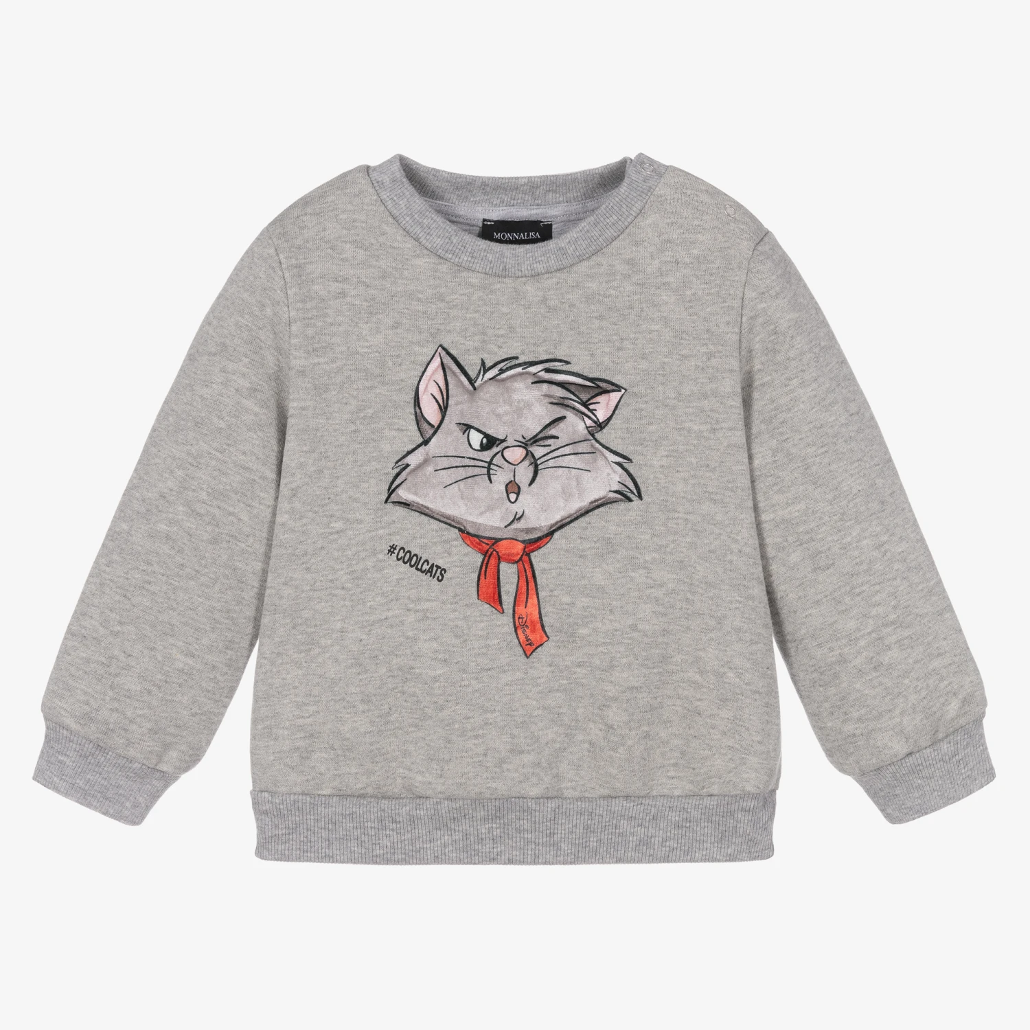 Grey marl sweatshirt for little boys by Monnalisa, made in comfortable cotton jersey with a soft fleecy feel inside. It has Disney’s Berlioz Aristocat appliqué on the front in soft padded velour with ‘#coolcats’ printed underneath. There are useful popper fastenings on one shoulder to make dressing easier.