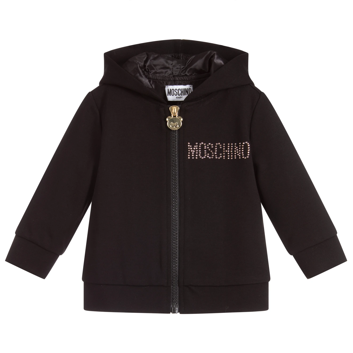 A cute black hooded zip-up for little boys and girls by Moschino Baby, made in a lightweight Milano jersey, with a silky lining. It has a diamanté logo on the chest, with matching Teddy logo on the back.