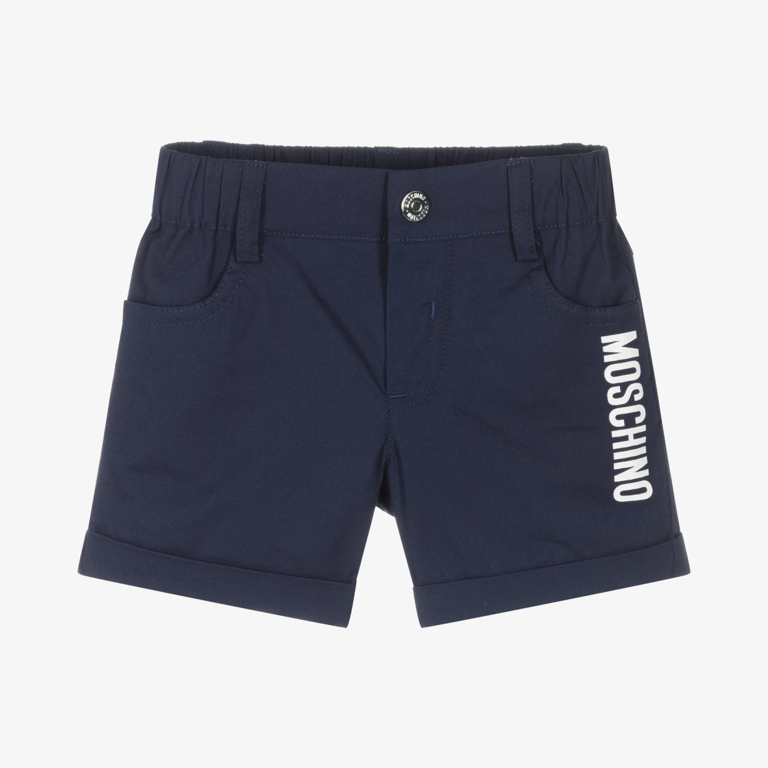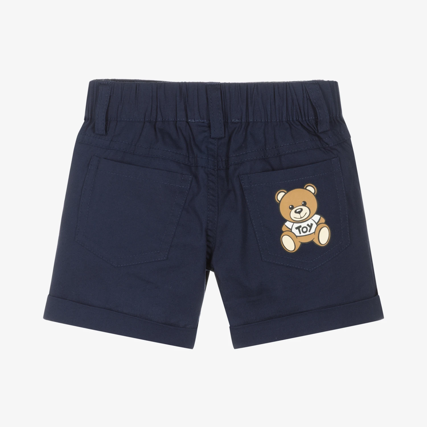 Navy blue chino shorts for little boys and girls, by luxury brand Moschino Baby. Made in soft cotton twill with slight stretch, these shorts fasten with a popper and have an elasticated waist for comfy wear. Instantly eye-catching, there is a white logo print on the front, with the iconic Teddy Bear motif on the back pocket.