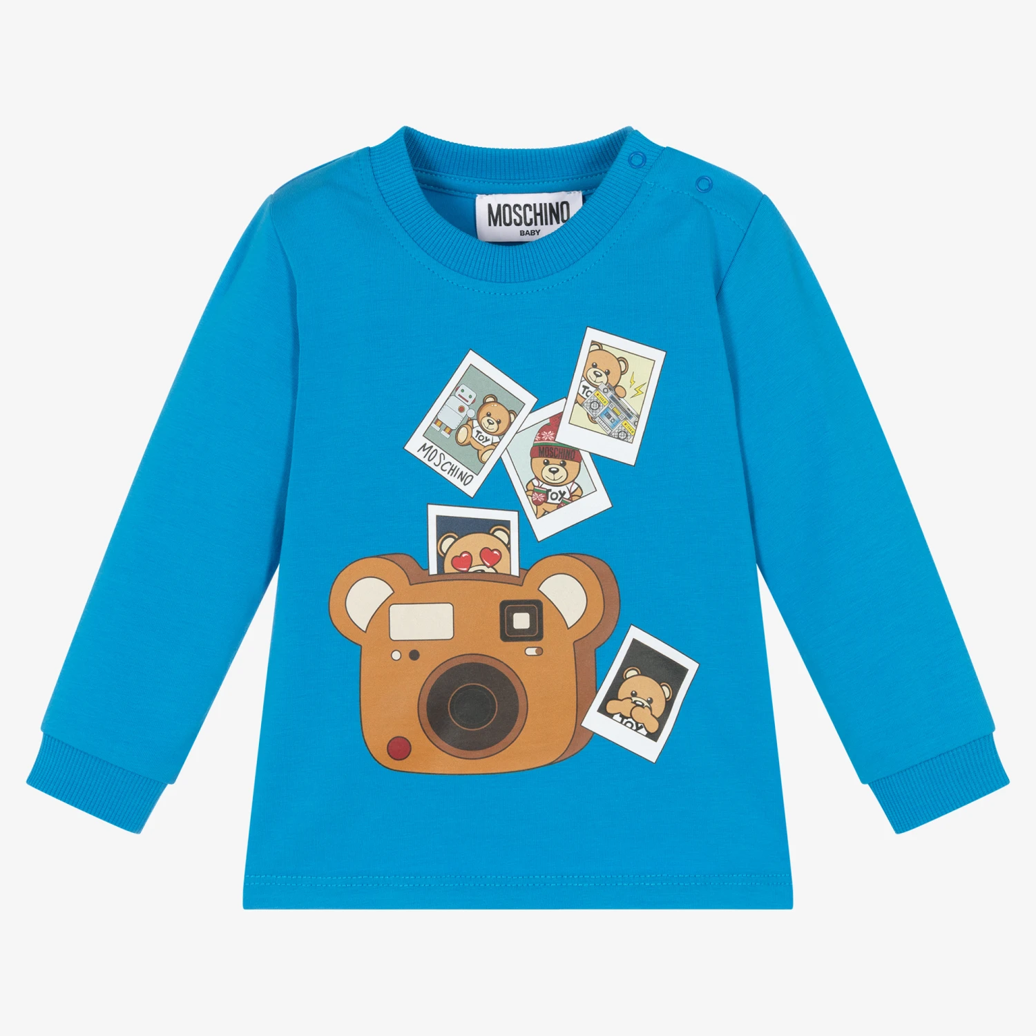 A bright blue top for little girls and boys by Moschino Kid-Teen. This fun design captures the designer’s famous Teddy Bear logo in Instamatic style photos as Teddy travels on his adventures.