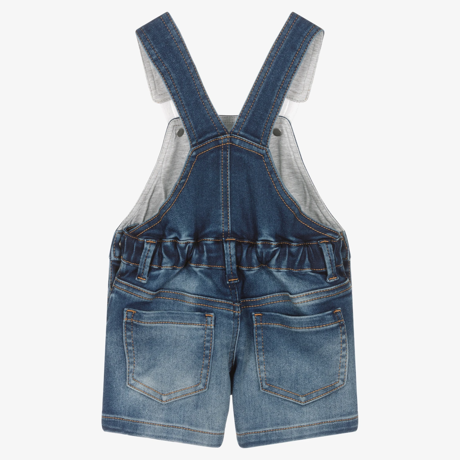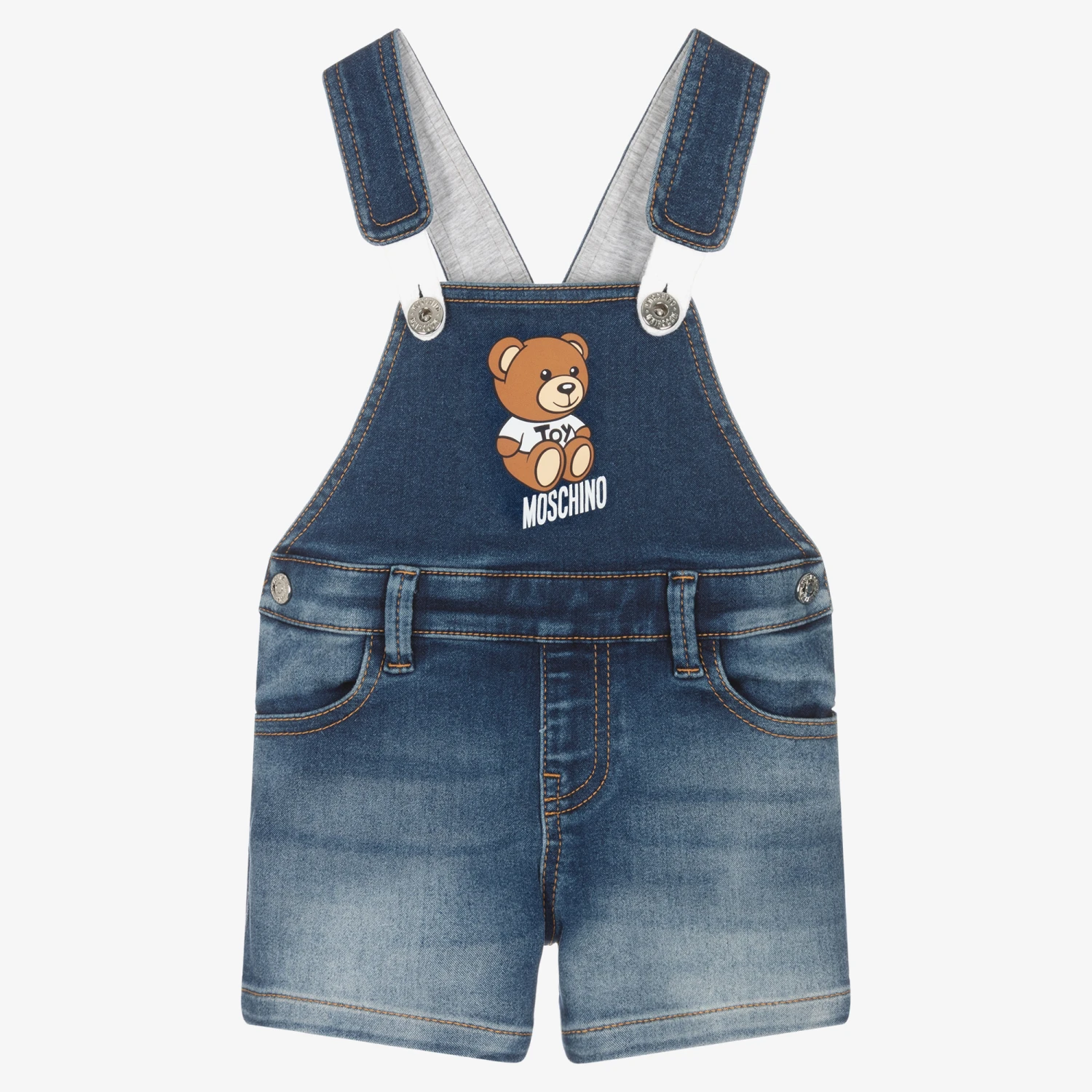 Cute blue dungarees for little boys by luxury Italian brand Moschino Baby, printed with the instantly recognisable Moschino Teddy Bear logo. Made in soft and stretchy denim, they have front pockets and adjustable button fastening shoulder straps. There is a popper fastening on either side to help with dressing.