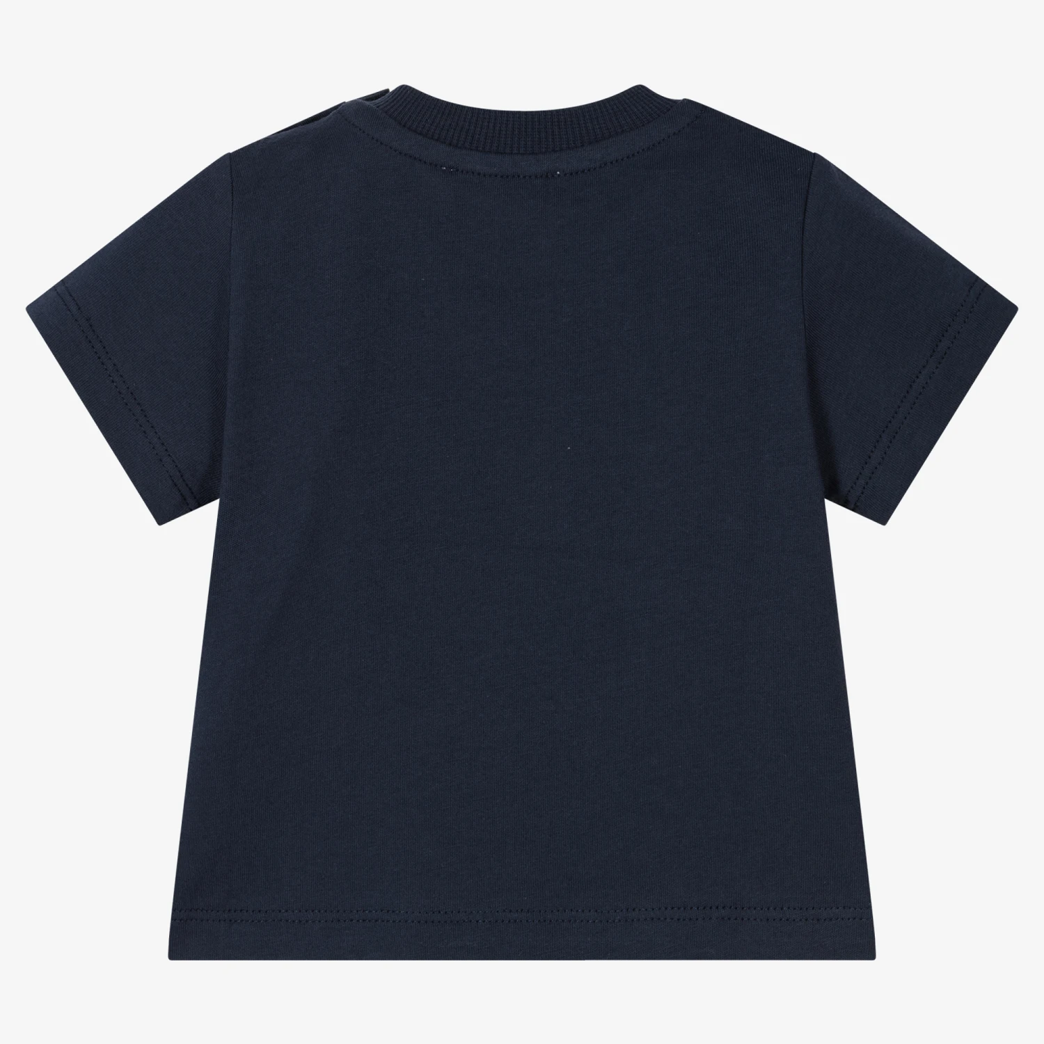 Cute navy blue cotton T-shirt for little boys, unmistakably by luxury Italian brand Moschino Baby, with the designer’s signature Teddy Bears and logo printed on the front. Made in comfortable jersey, it has a ribbed neckline and useful poppers on one shoulder to make dressing easy.