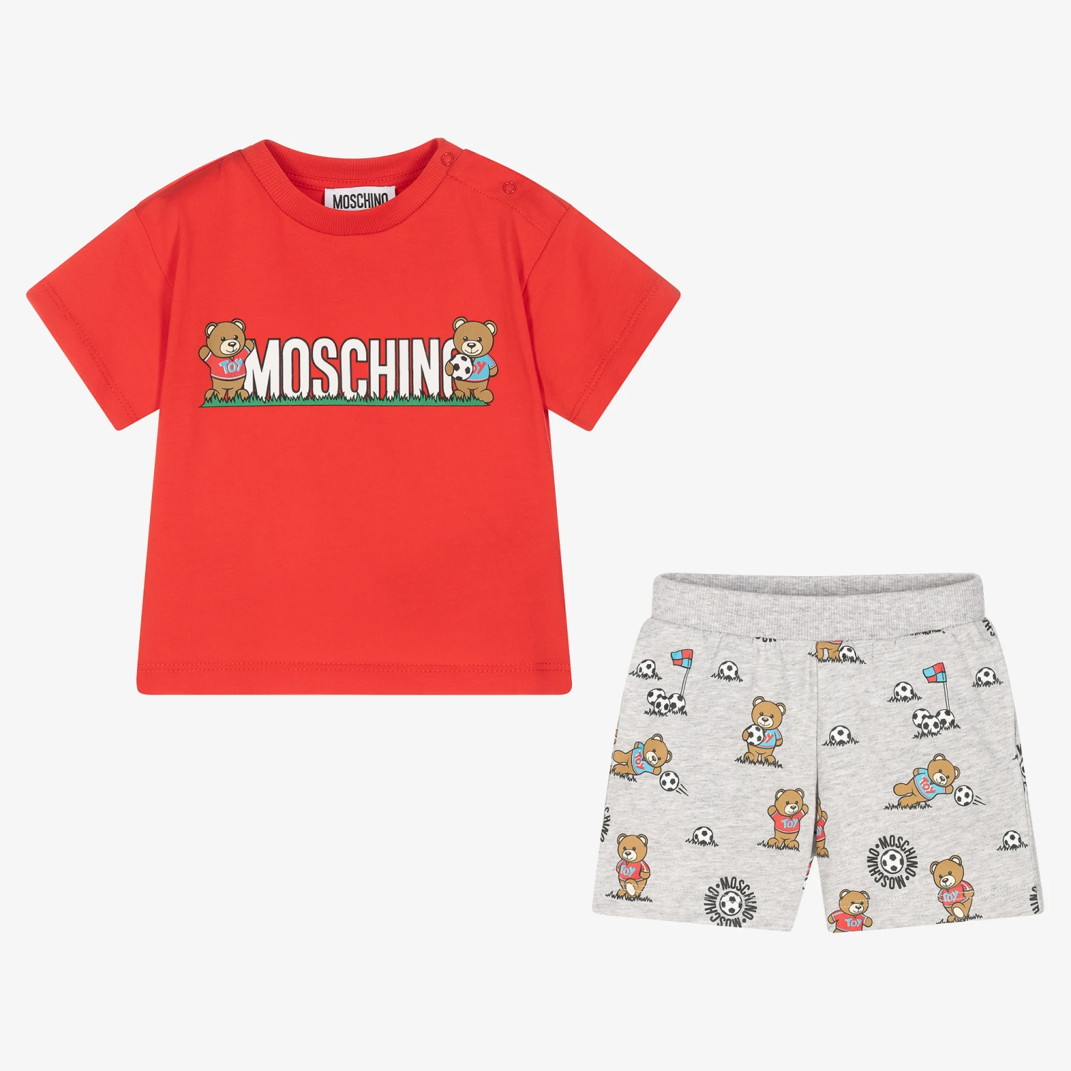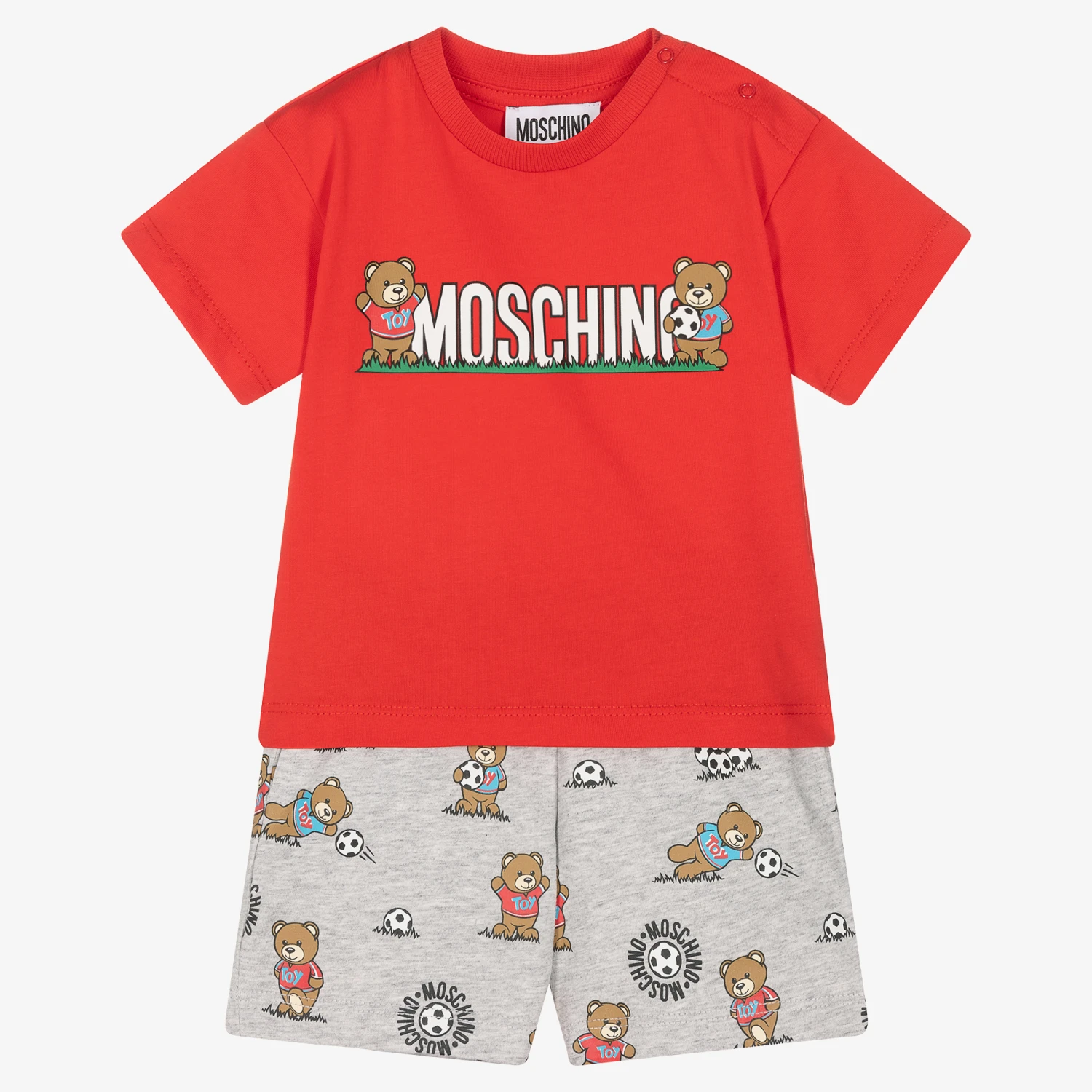 A red and grey shorts set for little boys, by luxury fashion house Moschino Baby. Easy-to-wear, the cotton jersey T-shirt has shoulder popper fastenings, while the shorts have a stretchy waistband and comfy pockets. For an instantly recognisable look, both items feature the brand’s iconic Teddy Bear logo, having fun playing football.