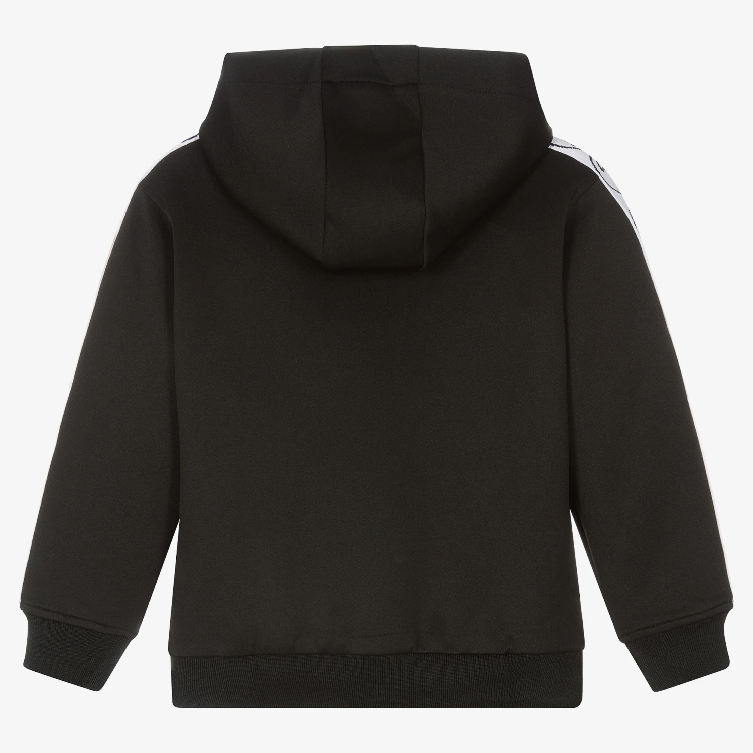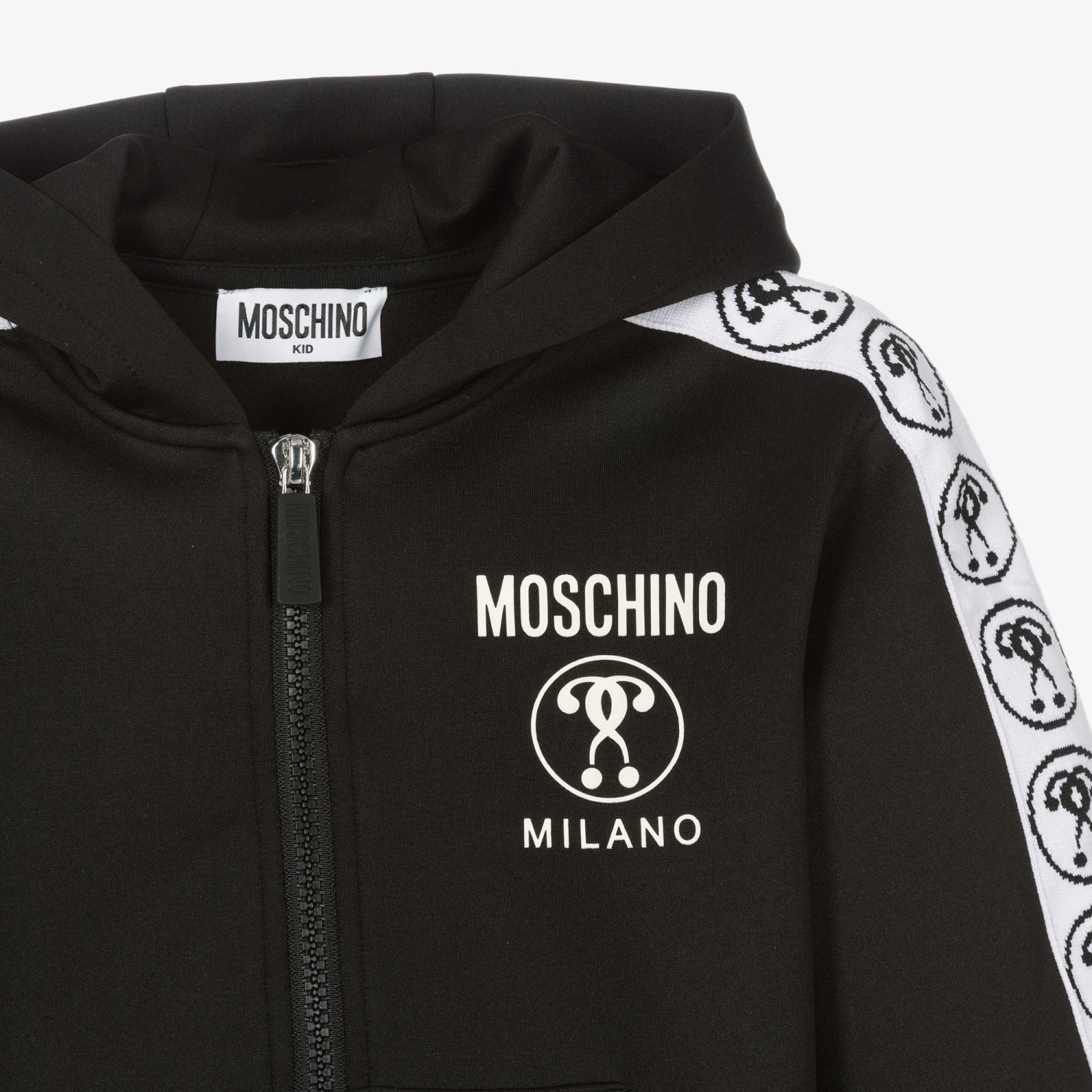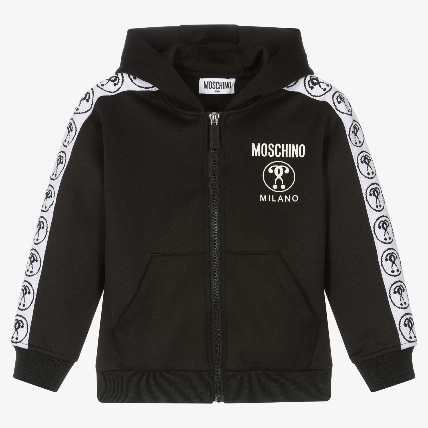 Mini-me black zip-up hoodie for boys and girls, by Moschino Kid-Teen. Made in silky sports jersey, it has a rubberised white logo on the chest, and hand pockets. The sleeves are trimmed with a Double Question Mark logo stripe for a sporty finish, and a black logo-embossed zip for an added designer detail.
