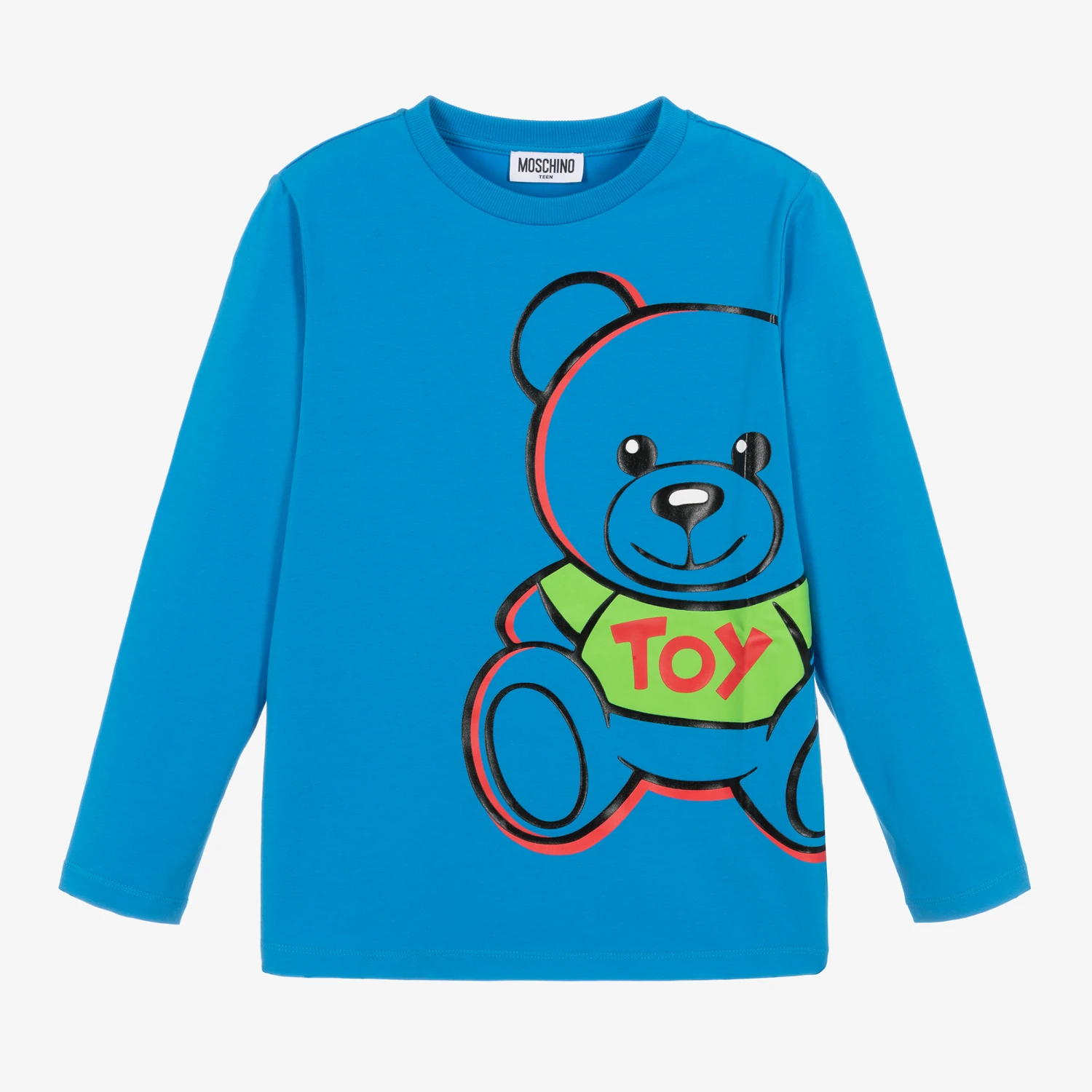 Blue cotton top for boys by luxury Italian brand Moschino Kid-Teen, with a large Teddy Bear logo printed on the front in black, red and green. Just right for casual days, it is made in soft, comfortable, lightweight jersey and has a ribbed neckline.