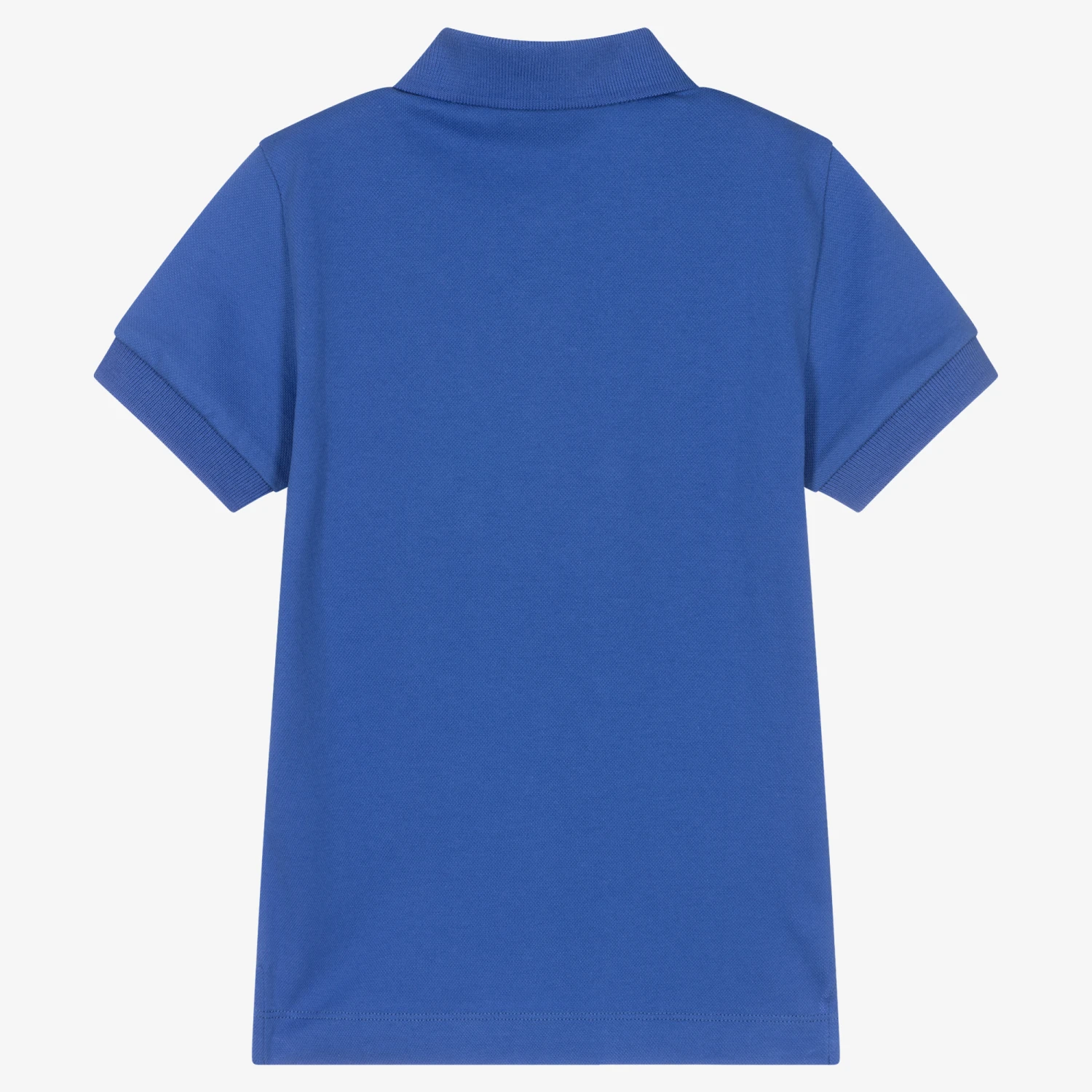 Mini-me blue polo shirt for boys by luxury Italian brand Moschino Baby, with the designer’s Double Smiley logo on the chest in white. Made in soft and comfortable cotton piqué, this classic style has a ribbed collar and front button fastenings.