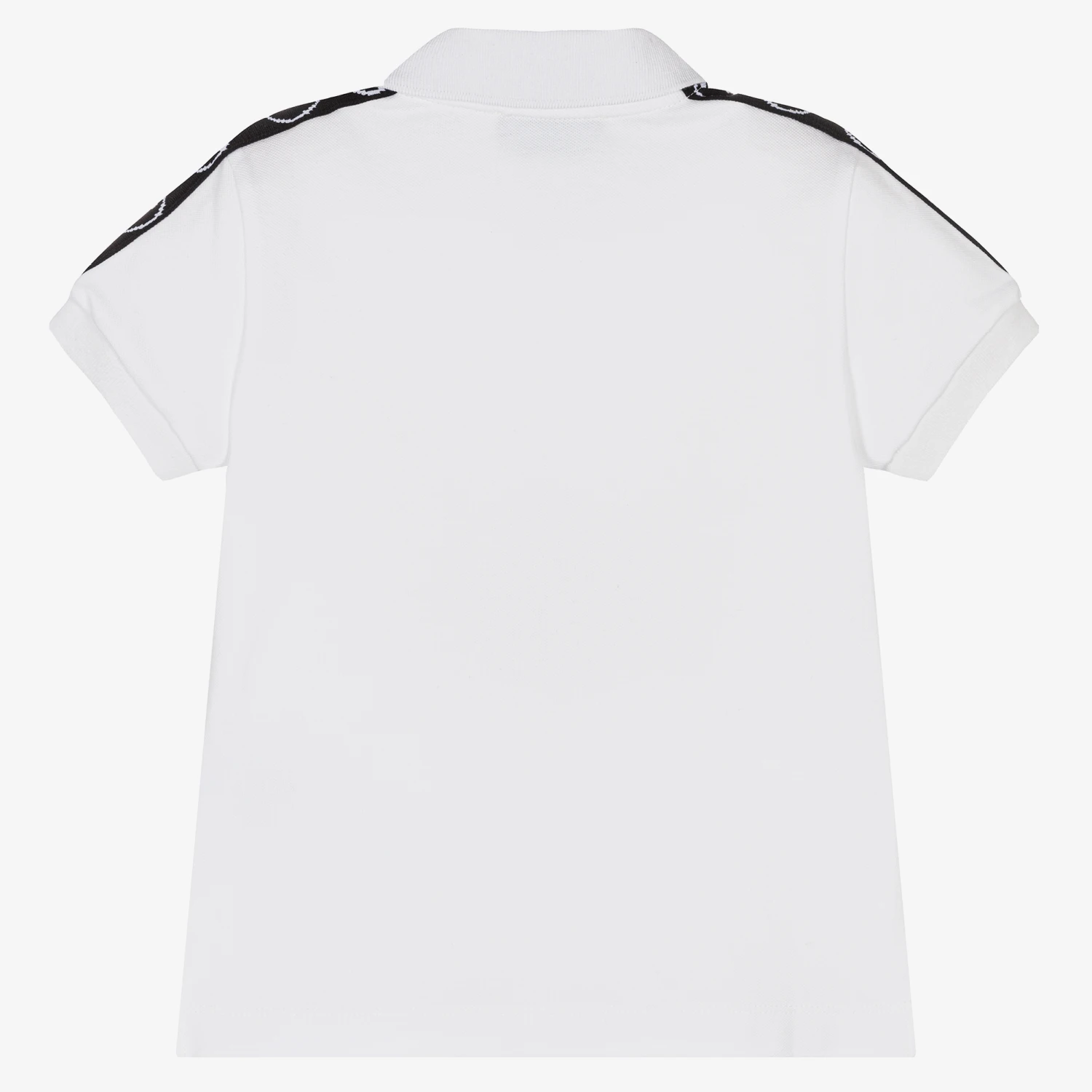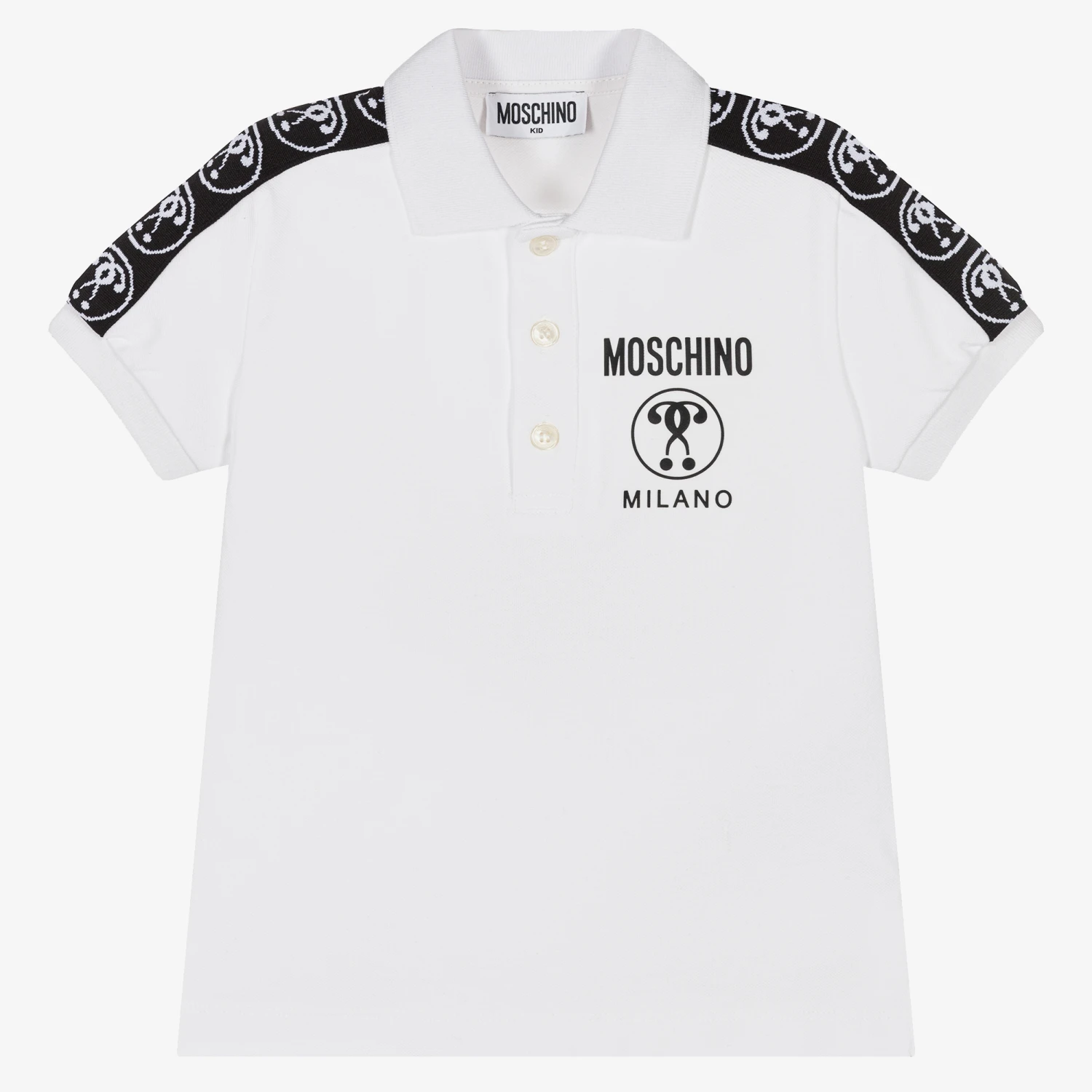Mini-me white polo shirt for boys by Moschino Kid-Teen, made in soft cotton piqué. Inspired by the brand’s timeless and seasonal logos, it has a classic rubberised logo print on the chest in black, and Double Question Mark logo taping on the shoulders. Cool and contemporary, the button fastenings on the front placket are branded for an added designer detail to this smart-casual style.