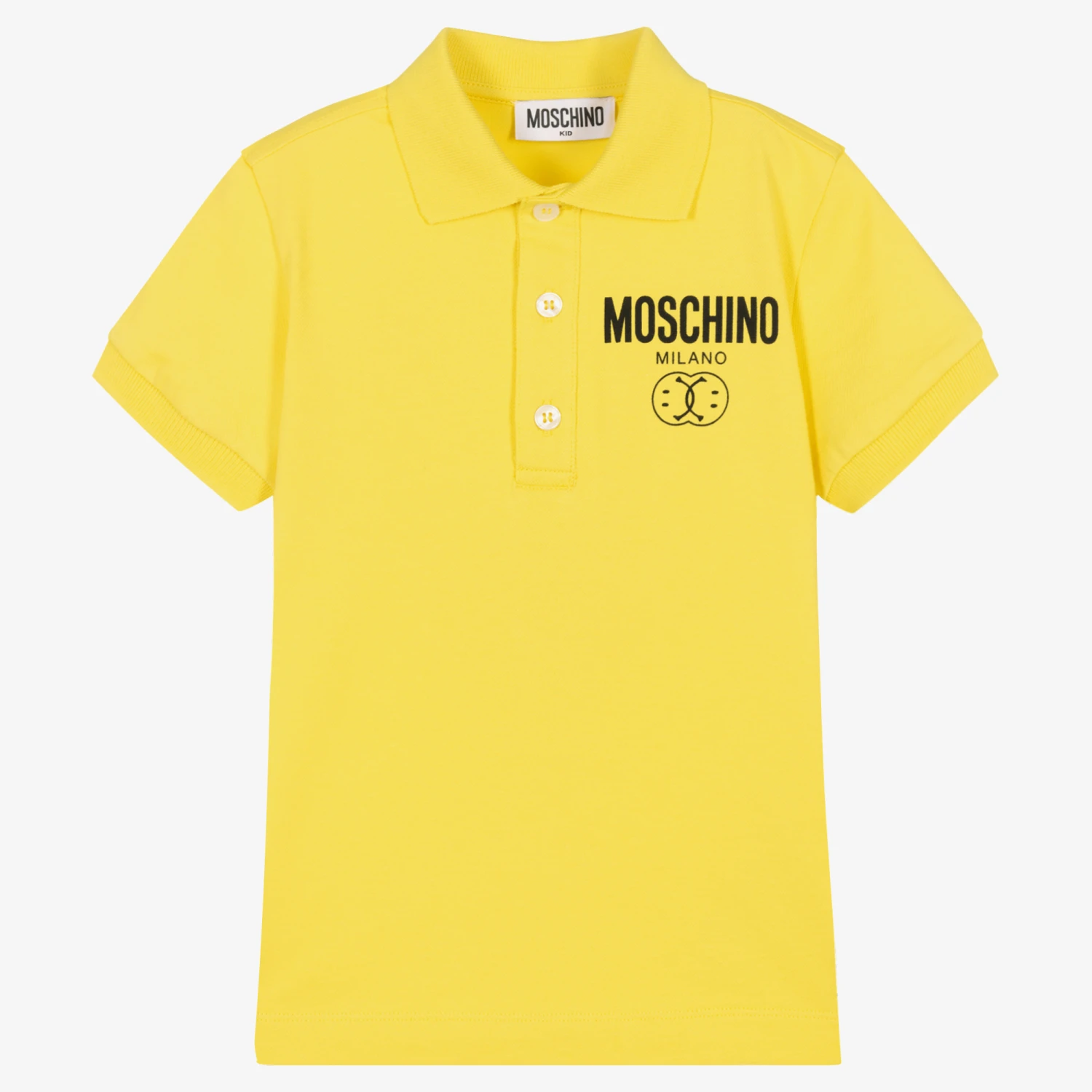 Mini-me yellow polo shirt for boys by luxury Italian brand Moschino Baby, with the designer’s Double Smiley logo on the chest in black. Made in soft and comfortable cotton piqué, this classic style has a ribbed collar and front button fastenings.