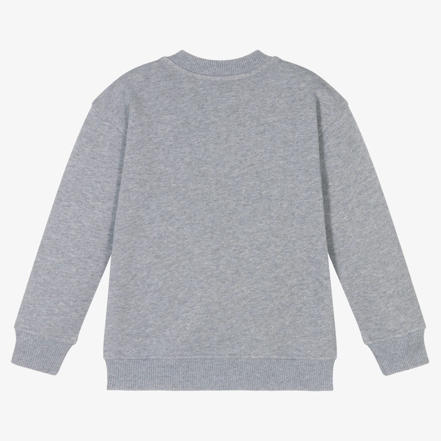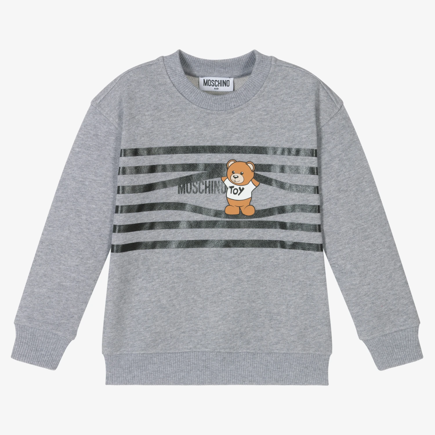 Boys and girls grey cotton sweatshirt from Moschino Kid-Teen, with comfortable ribbed trims. Combining fit and style, it has black stripes on the front with the brand’s Moschino Teddy Bear holding them up.