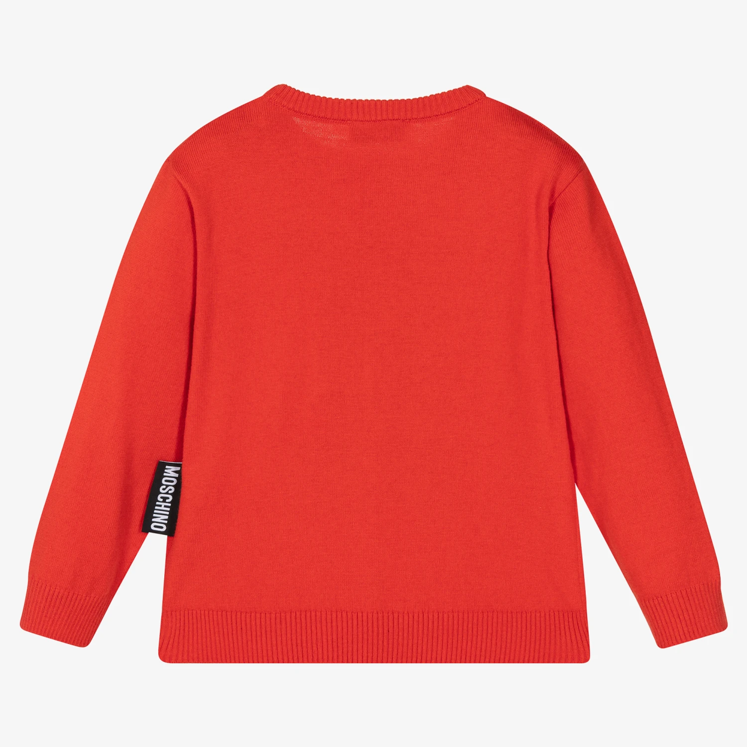 A red sweater for boys and girls by Moschino Kid-Teen. Knitted in a super-soft cotton and wool blend, it has snowboarding Moschino Teddy Bear logo motif, with bouclé ‘snow’ and an embroidered spell-out logo. A black and white branded tab is stitched on the side seam to complete the designer look.