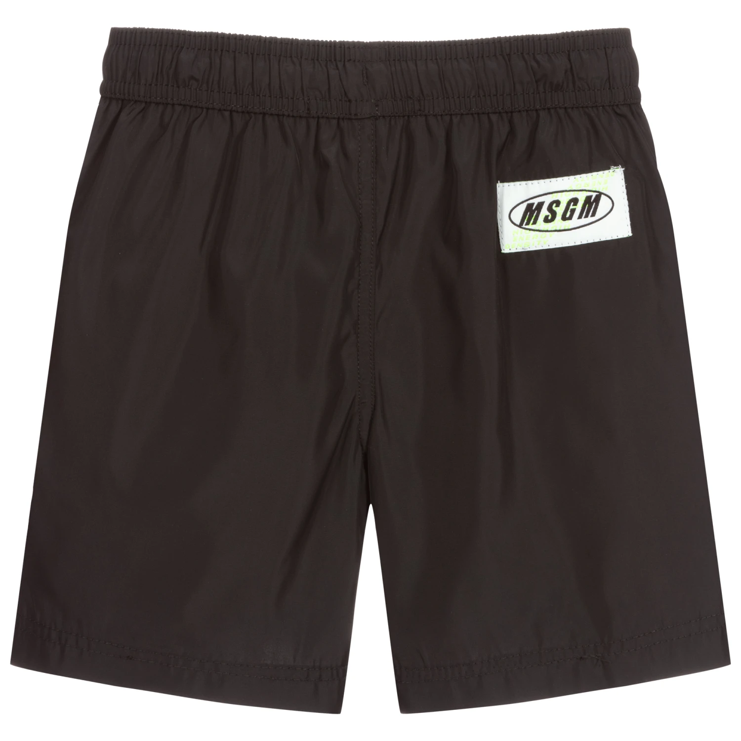 Black swim shorts for boys by MSGM, with bold white logo prints across the front. Lightweight and silky with a soft mesh lining, they have a branded drawstring tie and useful side pockets. There is an embroidered logo patch on the back.