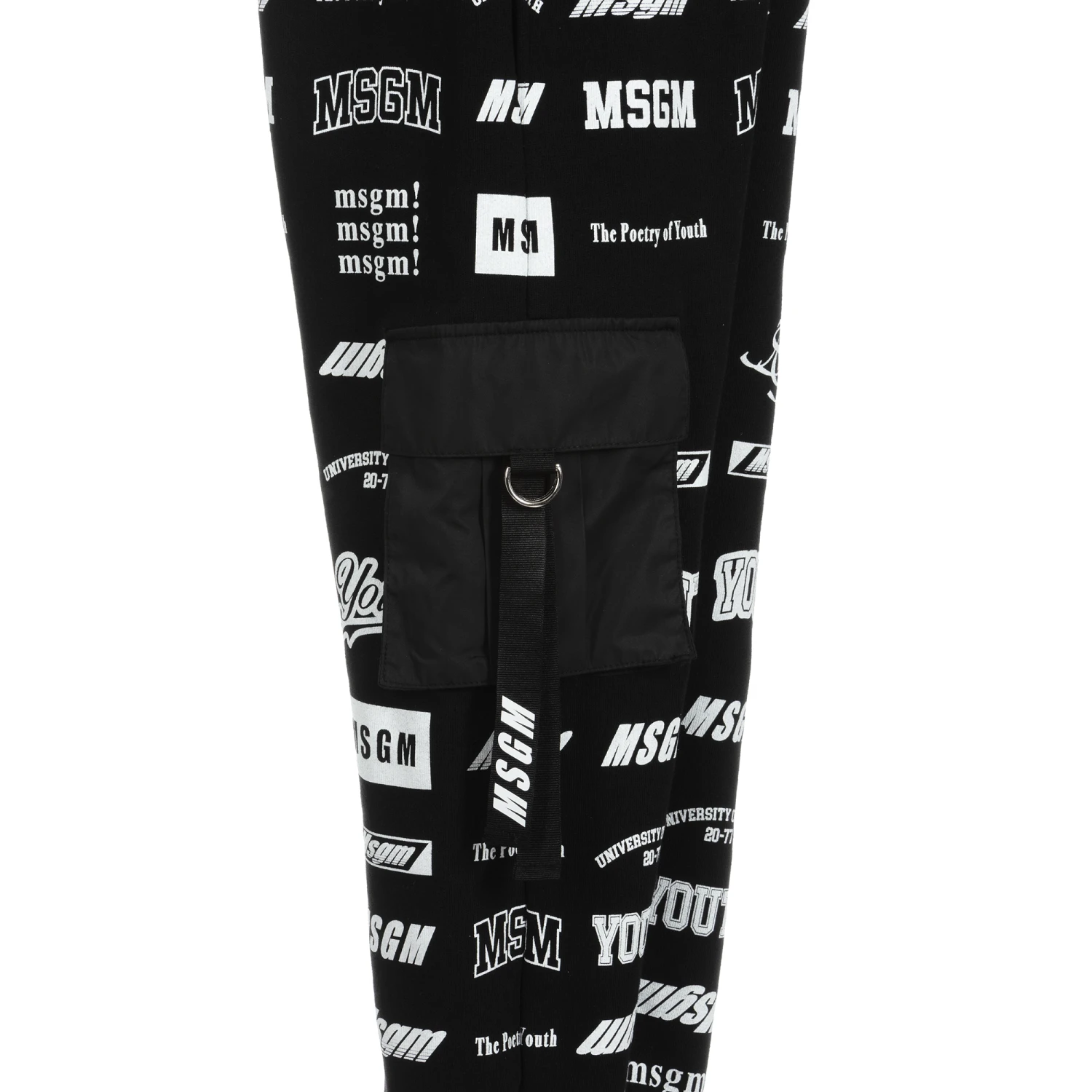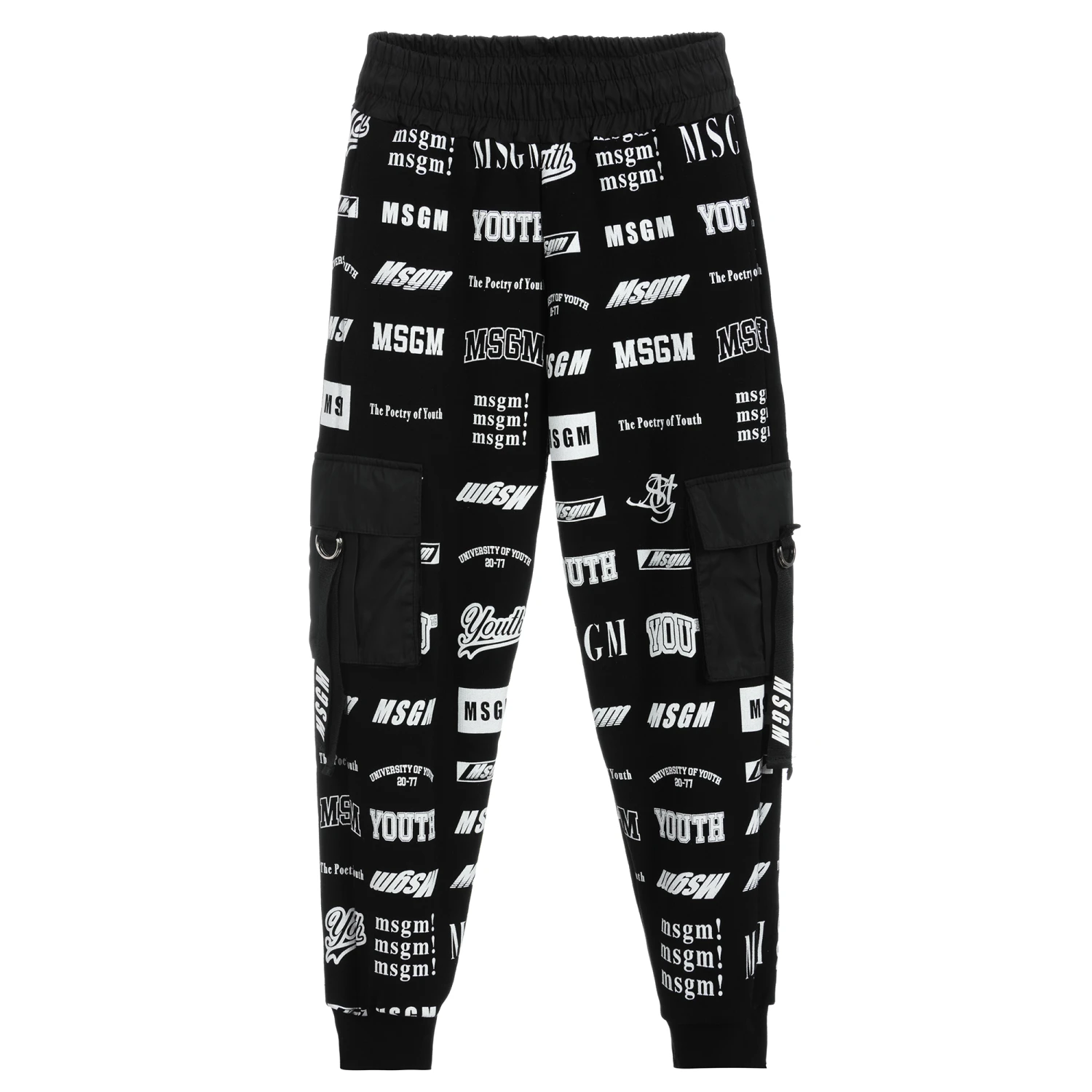 Black joggers by Italian brand MSGM. Made in comfortable cotton jersey with a fleecy underside, they are patterned with white logos. The black cargo pockets on the sides of the legs fasten with grosgrain logo ribbons.