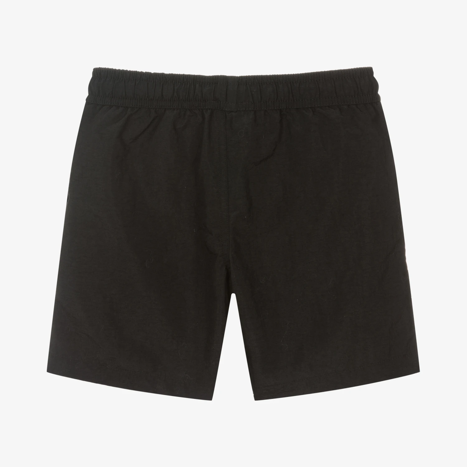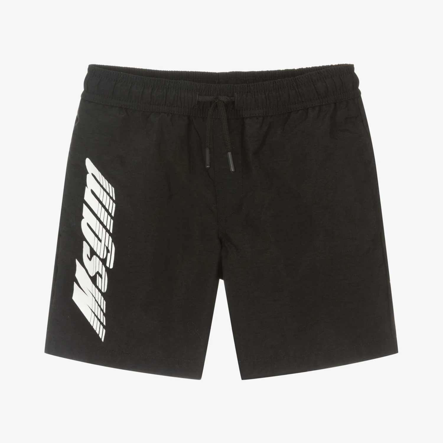 Black swim shorts for boys by MSGM, with a white racing-inspired logo print on one leg. Ideal for swimming or lounging on the beach, they are soft and lightweight with a mesh lining for comfort. There are useful, concealed side pockets and a drawstring waistband for a great fit.