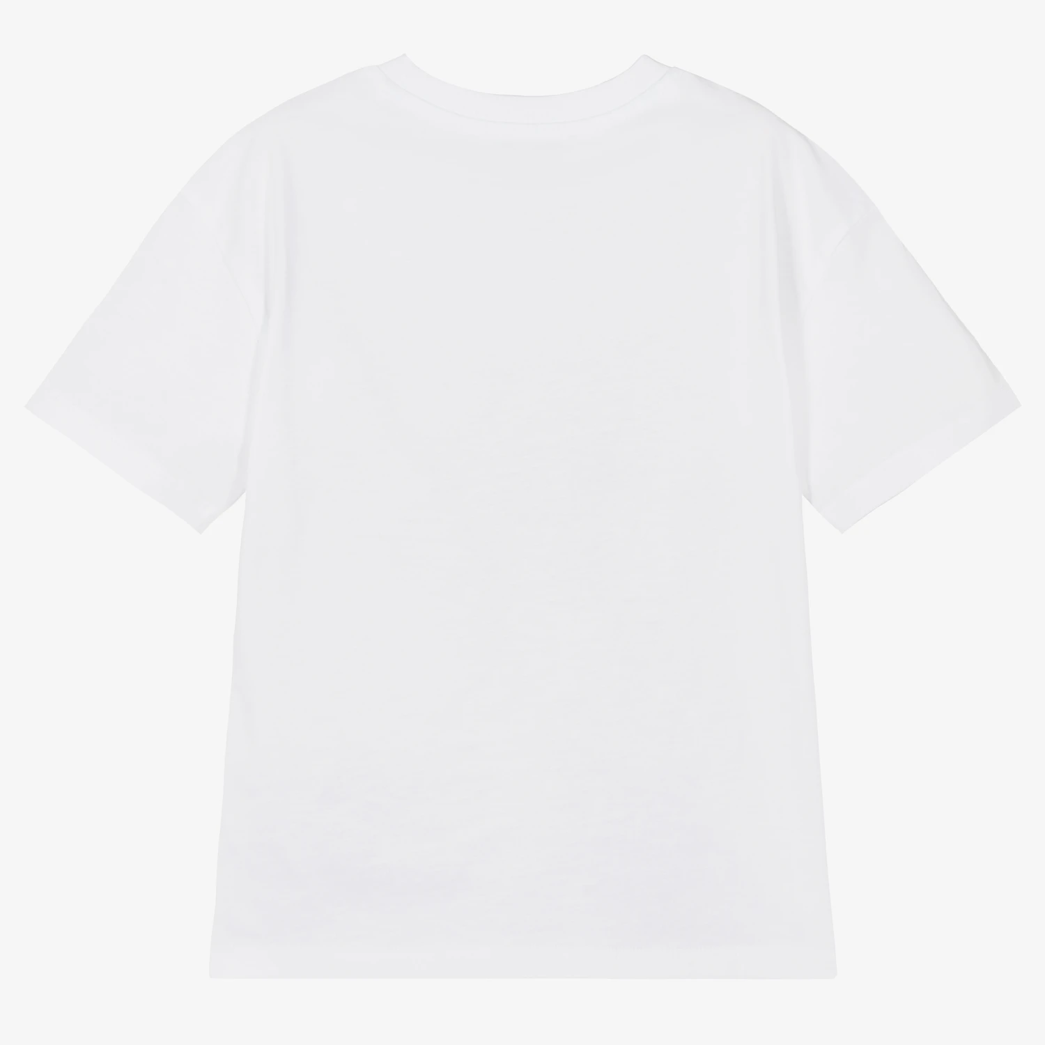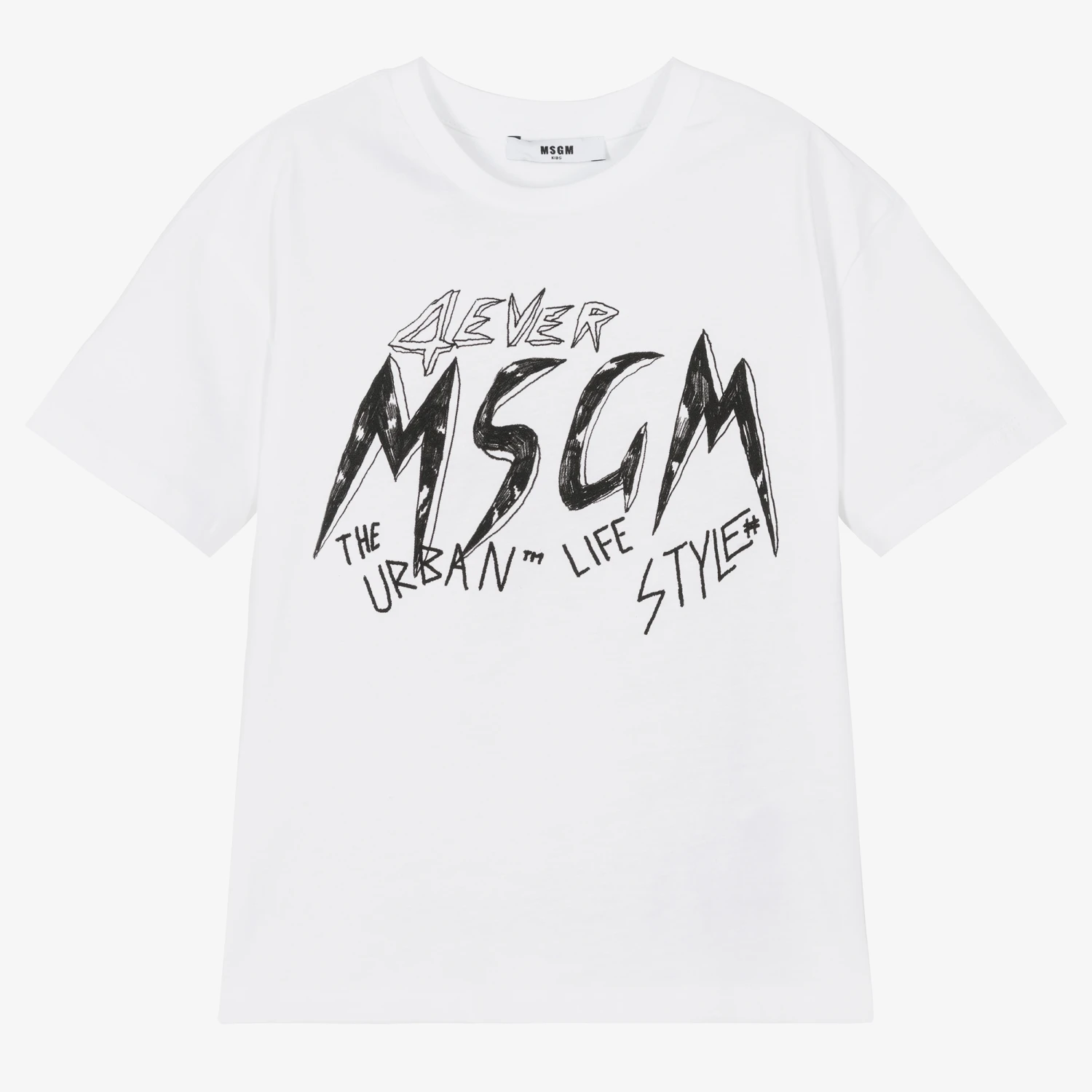 Cool white cotton T-shirt for boys from MSGM, styled with a classic crew neck. It has a black and white urban comic style logo and slogan print on the front.
