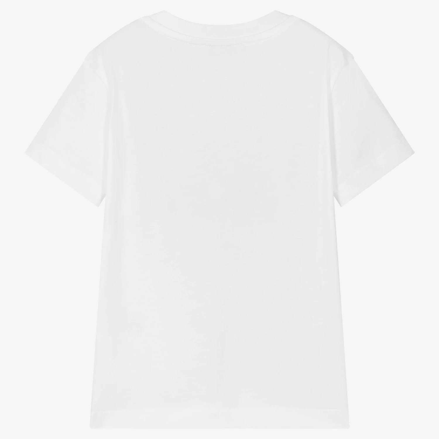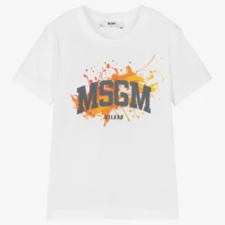 A white T-shirt for boys by Italian brand MSGM, made in soft and stretchy cotton jersey. Cool and creative, it has the brand’s logo printed in dark grey on the front, with an orange paint splatter design.