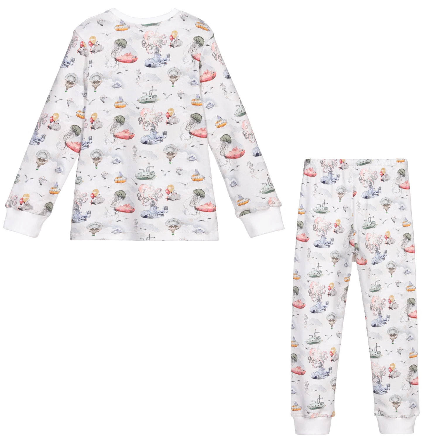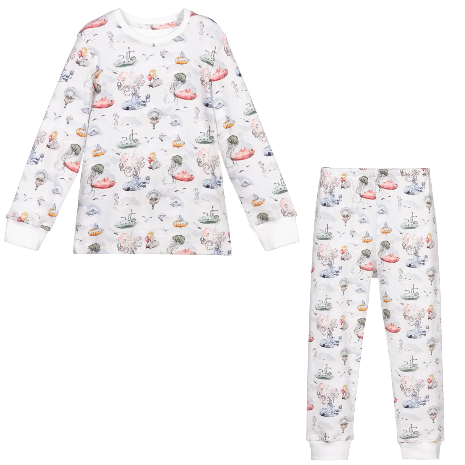 Boys pale grey pyjamas by My Little Pie, with a red, blue and green Under the Sea design. Beautifully soft against the skin, they are made in Supima cotton jersey. They have long sleeves, a gently elasticated waistband and the care details are printed, so there are no scratchy labels.