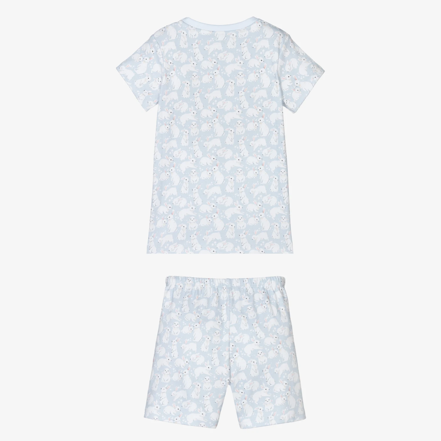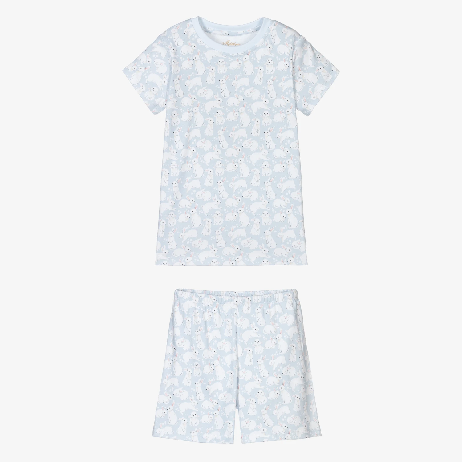Pale blue pyjamas for girls and boys by My Little Pie, with a sweet white rabbit print. Wonderfully soft against the skin, they are made in organic Supima cotton jersey, which is both strong and durable. The care details are printed, so there are no scratchy labels.