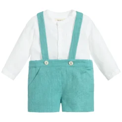 Little boys linen shorts and shirt outfit by Nanos. The ivory, collarless shirt is soft and lightweight, with a chest pocket and an embroidered logo. The aqua green shorts are fully lined, with elasticated, button fastening straps.