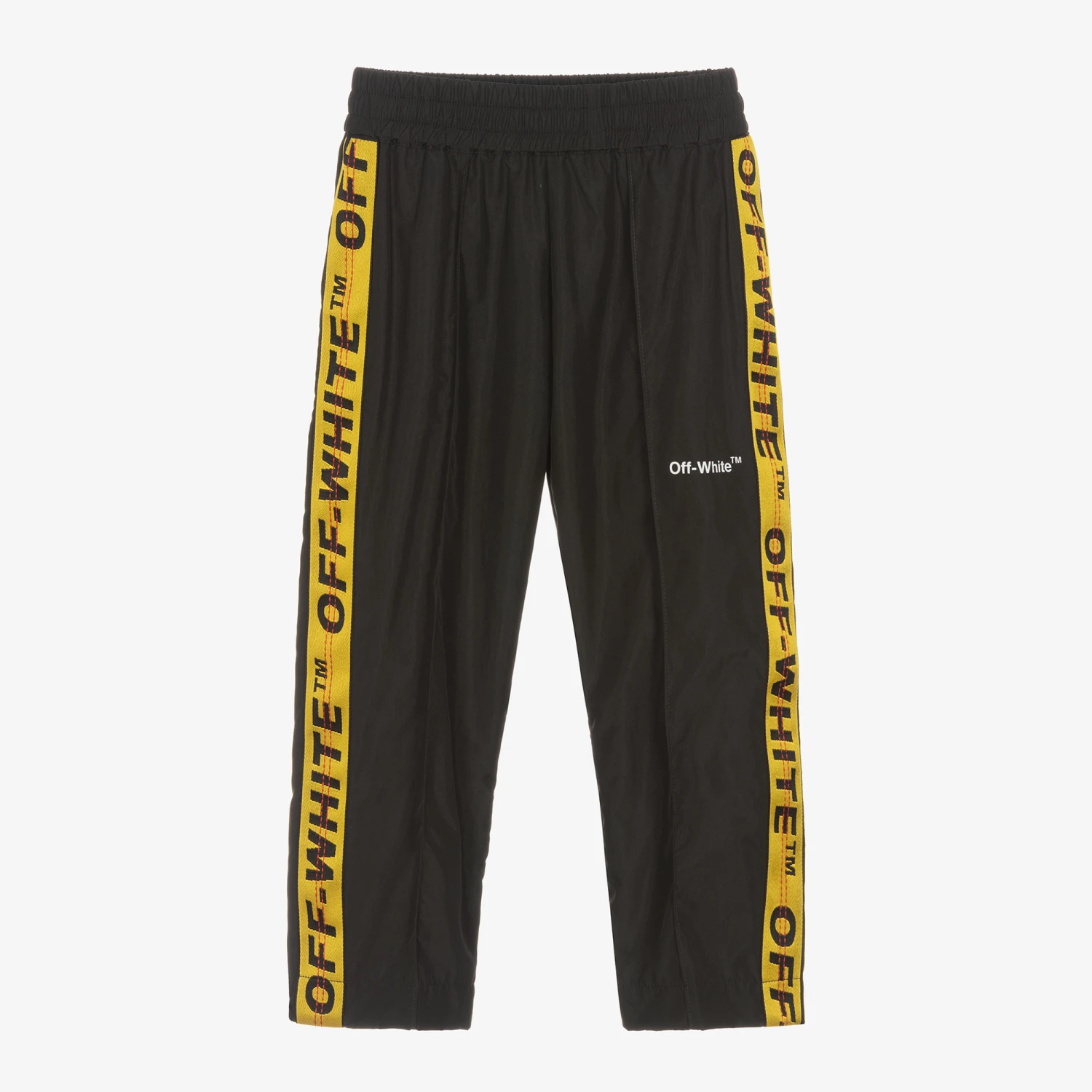 Boys black trousers from luxury designer Off-White. Made in silky-smooth fabric, these cool track pants are trimmed with the label’s distinctive Industrial branding in a yellow, black and red colourway. Tapering slightly towards the ankle, they have a white logo print on the front and an elasticated waist for comfort on little tummies.