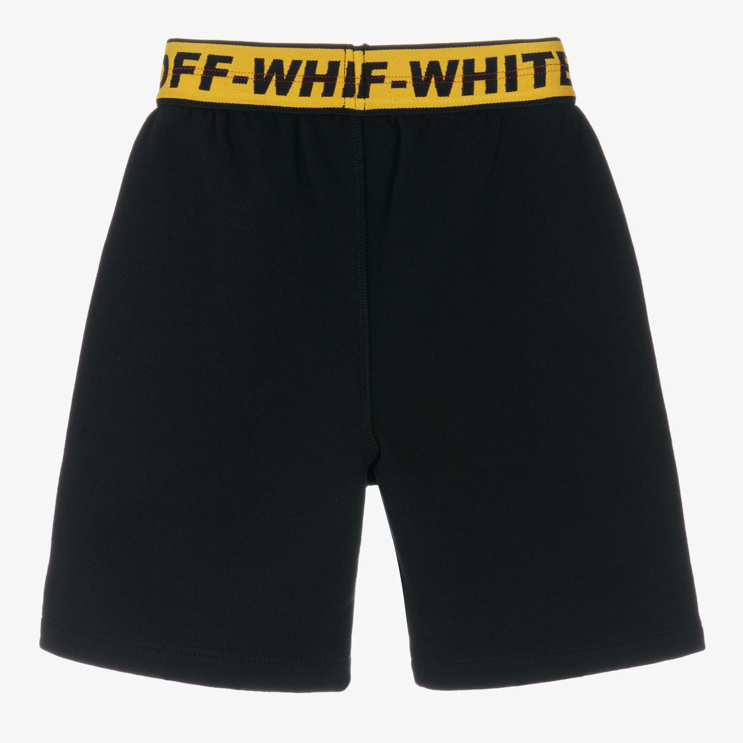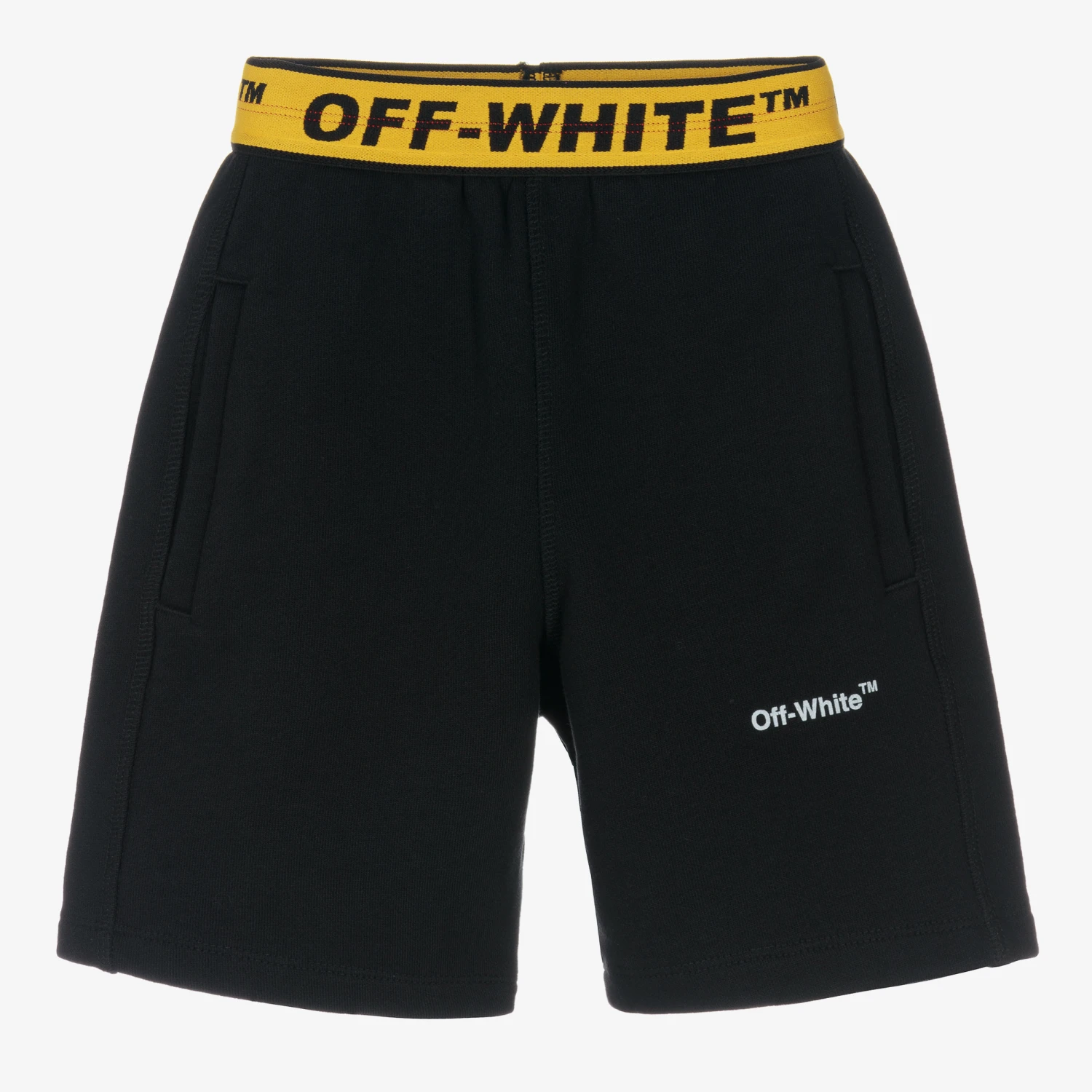 Streetwear-inspired black shorts for boys by luxury brand Off-White, in an effortlessly cool, laid-back vibe. Made in soft organic cotton jersey, this easy-to-wear style has a minimalist white logo print on one leg and slanted pockets. The striking black and yellow Industrial logo taping can be found on the elasticated waist, finishing the look with instant designer appeal.