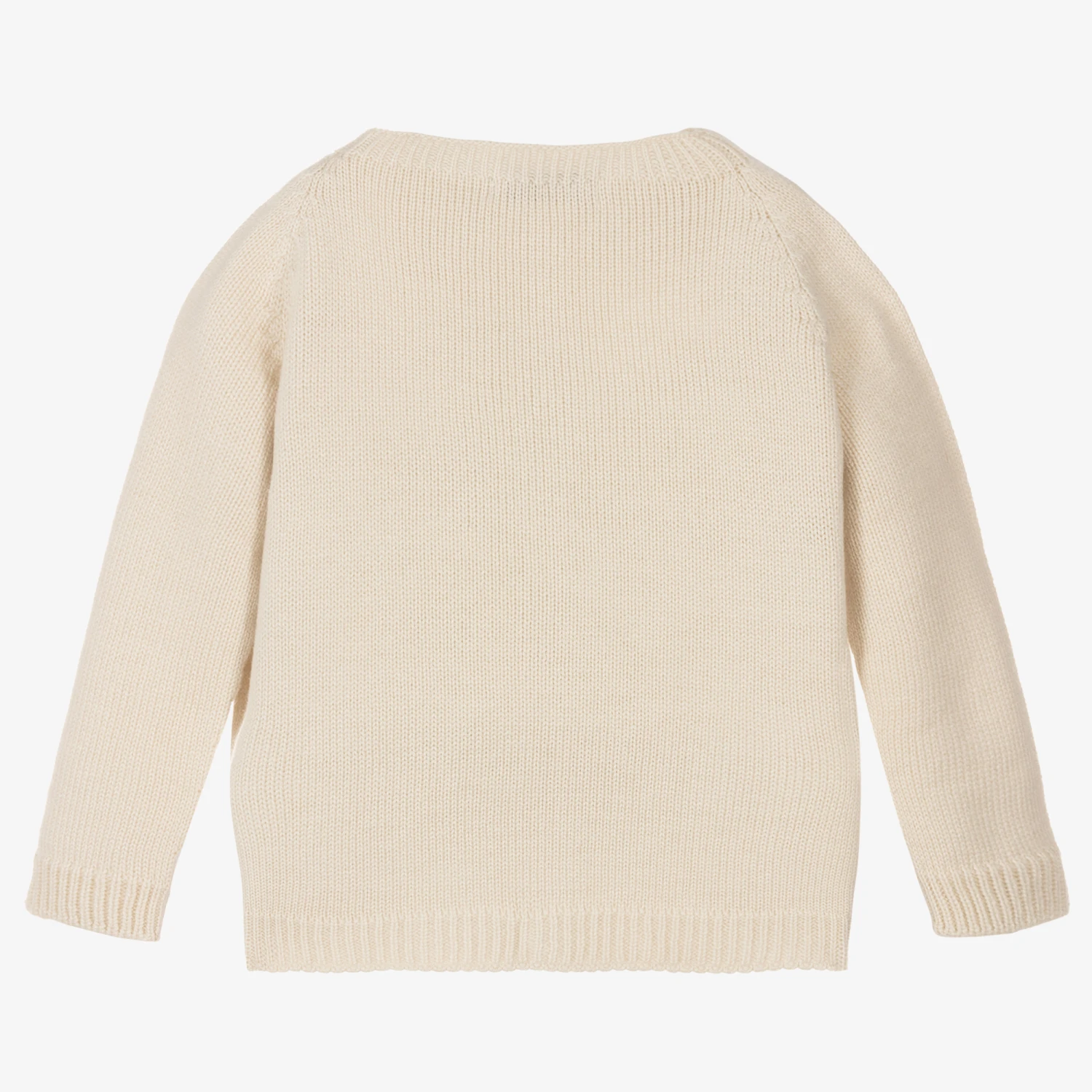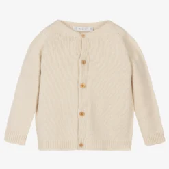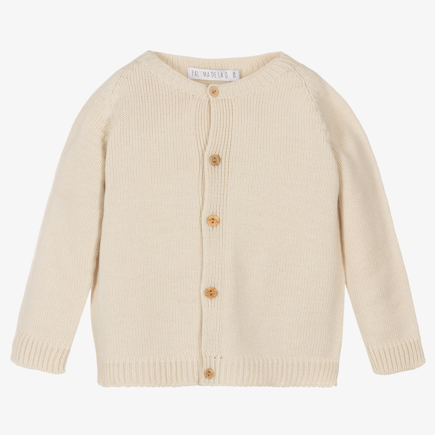 Soft wool blend beige knitted cardigan by Paloma de la O. Suitable for boys and girls, it fastens down the front with little wooden buttons for a traditional look.