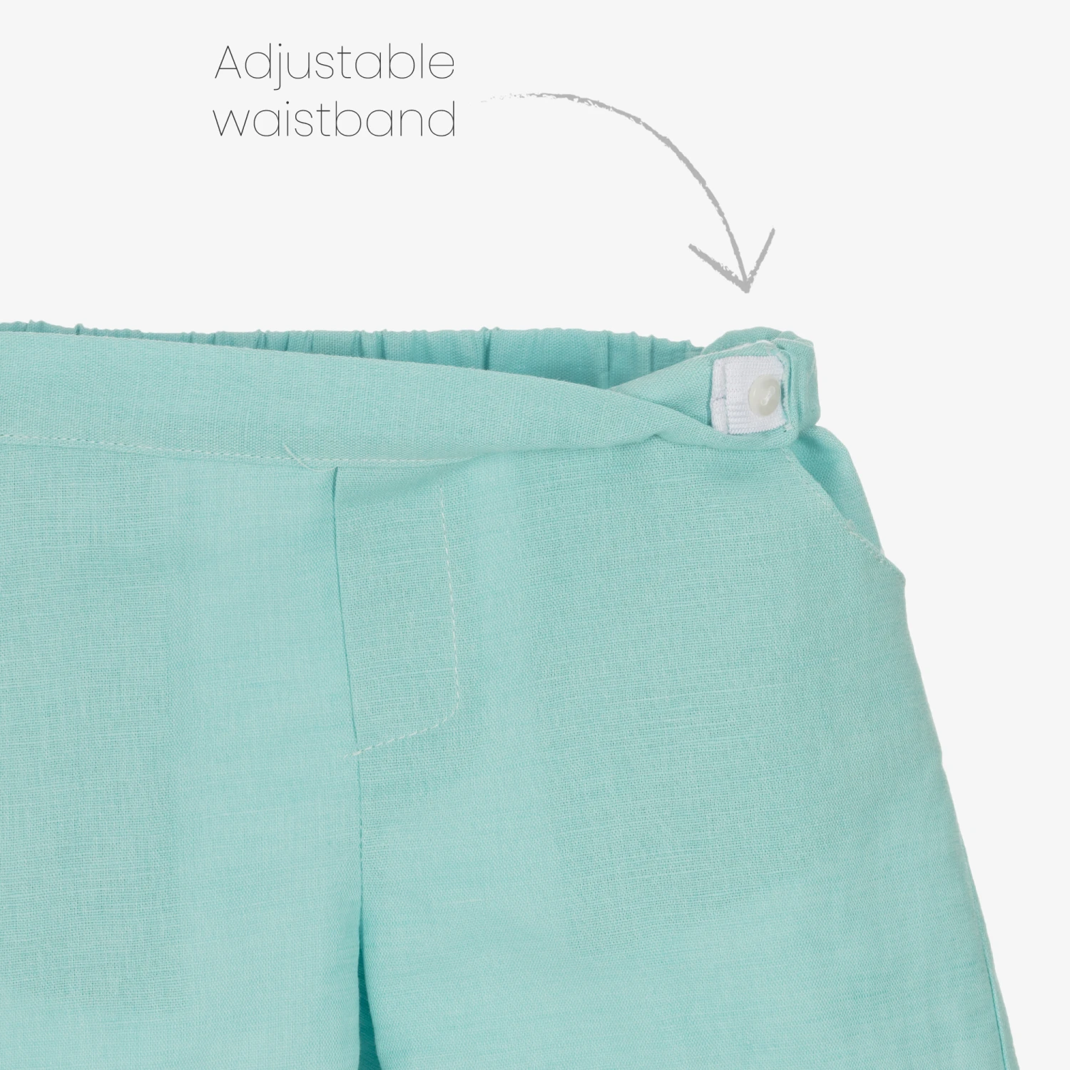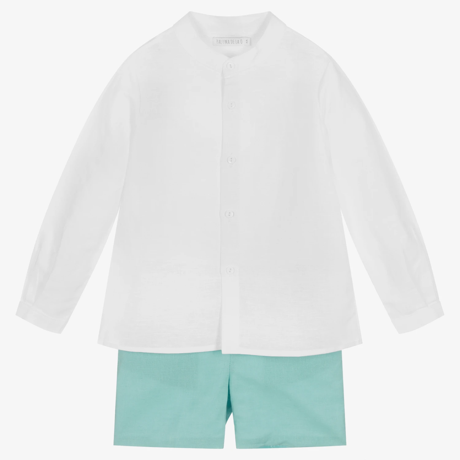 Boys white and blue shorts set from Paloma de la O, exclusive to Childrensalon. The collarless shirt is made in a soft cotton and linen blend, with buttons on the front and cuffs. With pockets on the hips, the aquamarine blue shorts have a lightweight cotton lining and an adjustable waistband for a comfortable fit and feel.