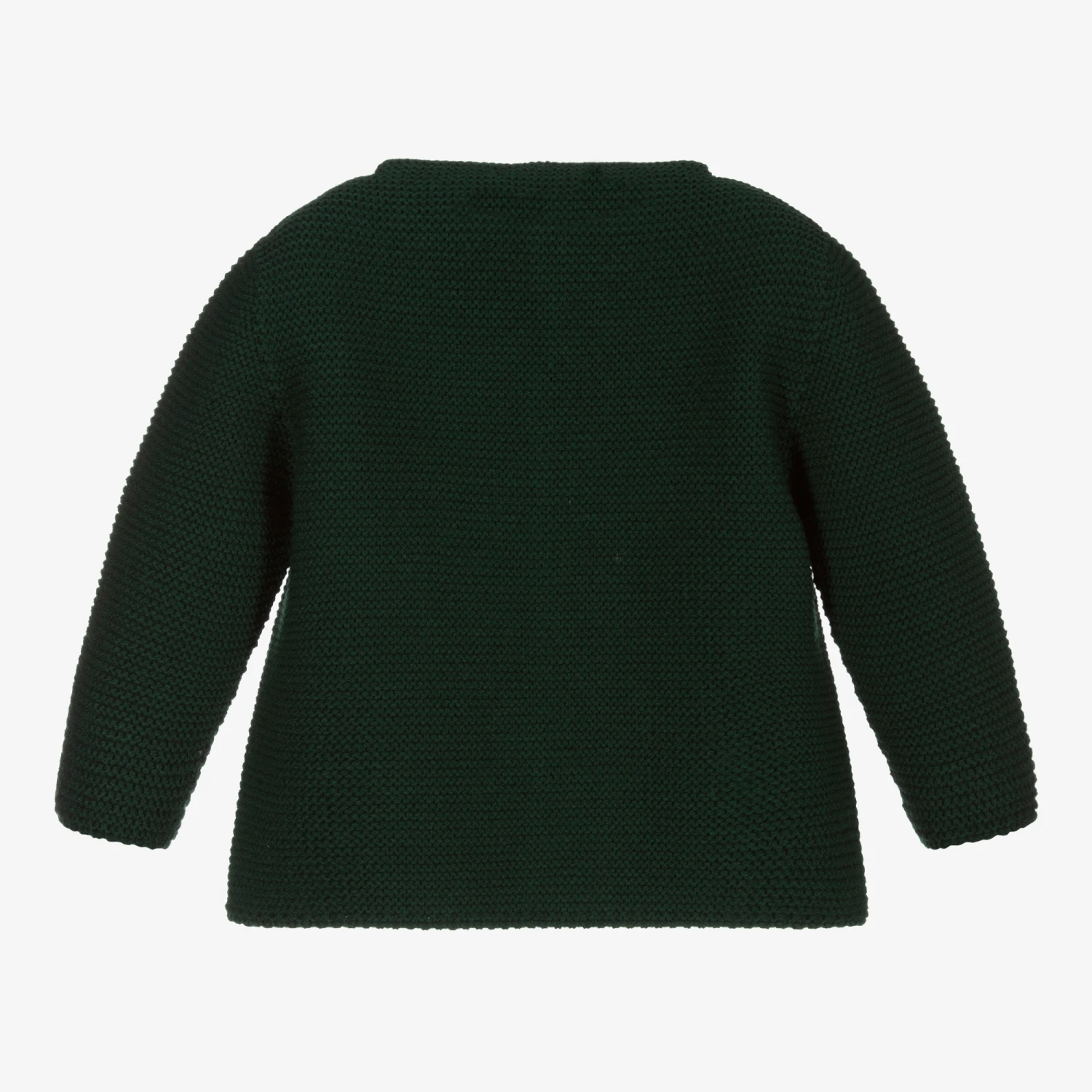 Green cardigan for younger boys and girls by Paloma de la O. Made in a mid-weight knit, it has wooden button fastenings on the front.