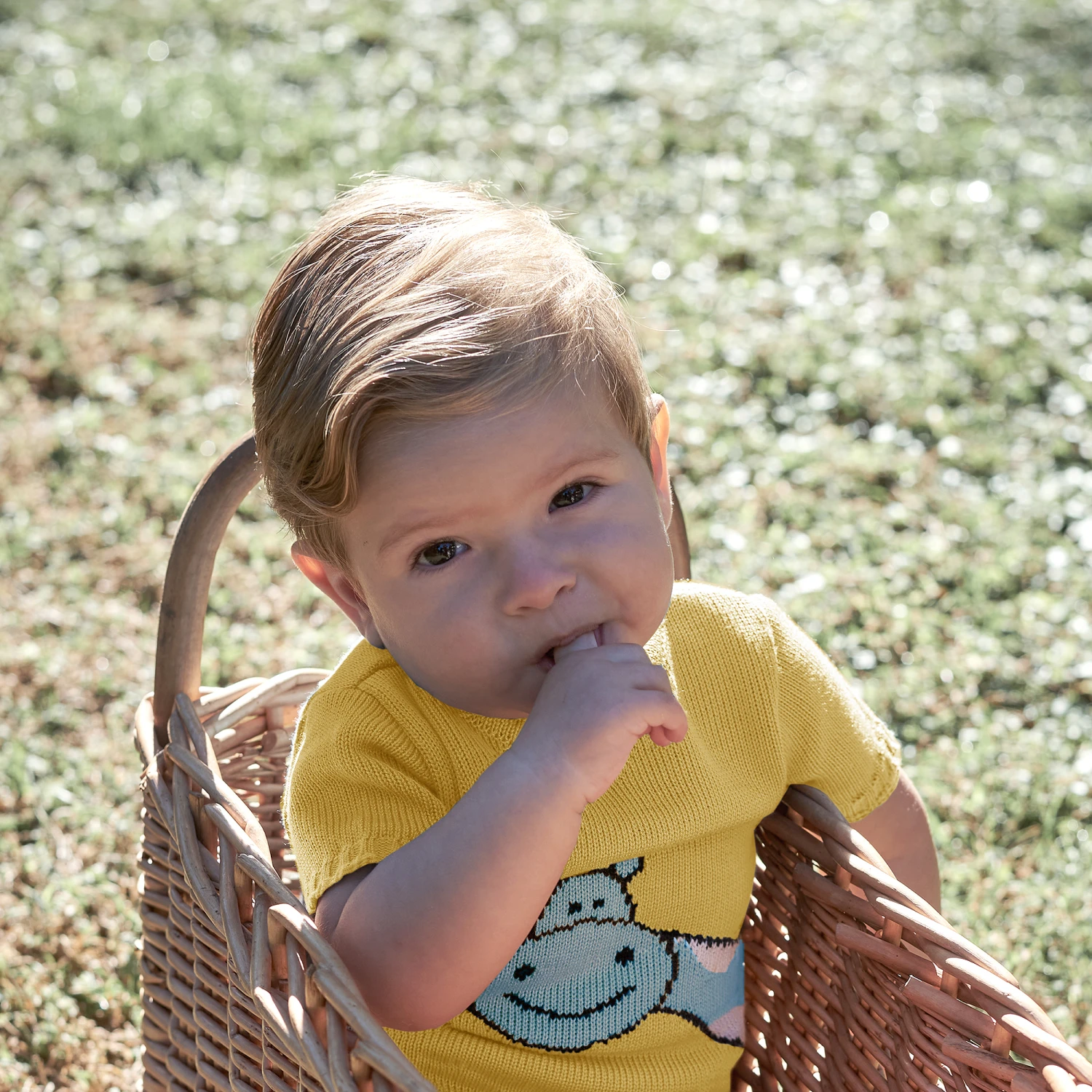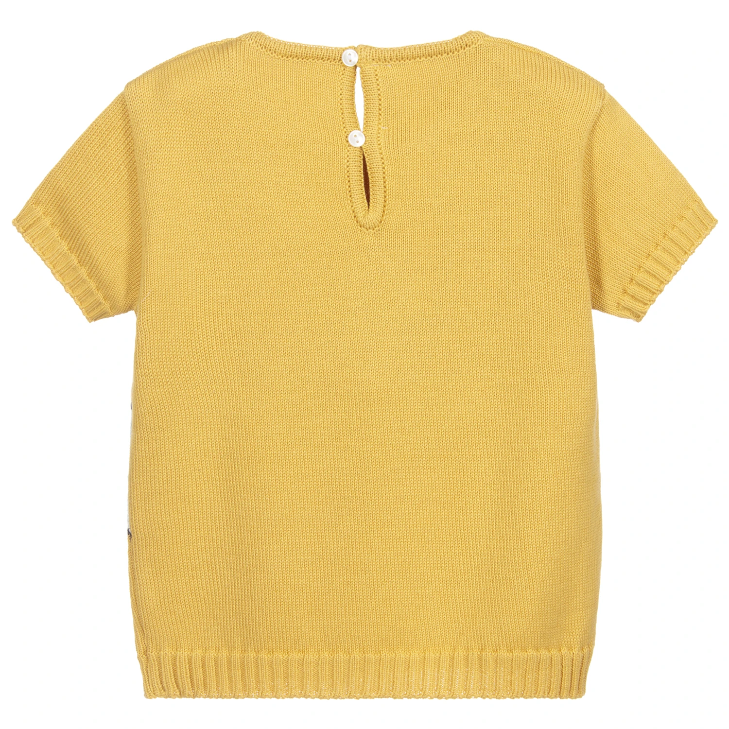 Younger boys mustard yellow sweater by Paloma de la O, with a cute green and ivory giraffe motif. Knitted from a soft cotton and acrylic blend, this short sleeved sweater has lightly ribbed edges and back button fastenings.