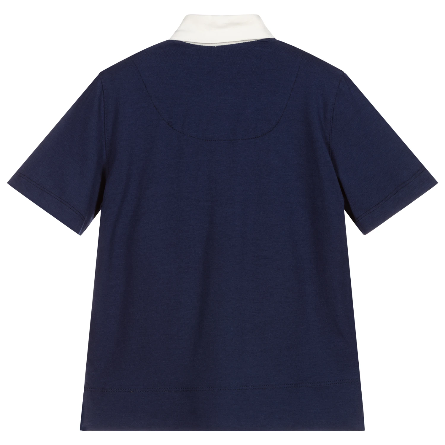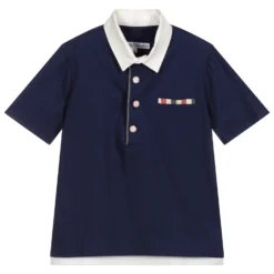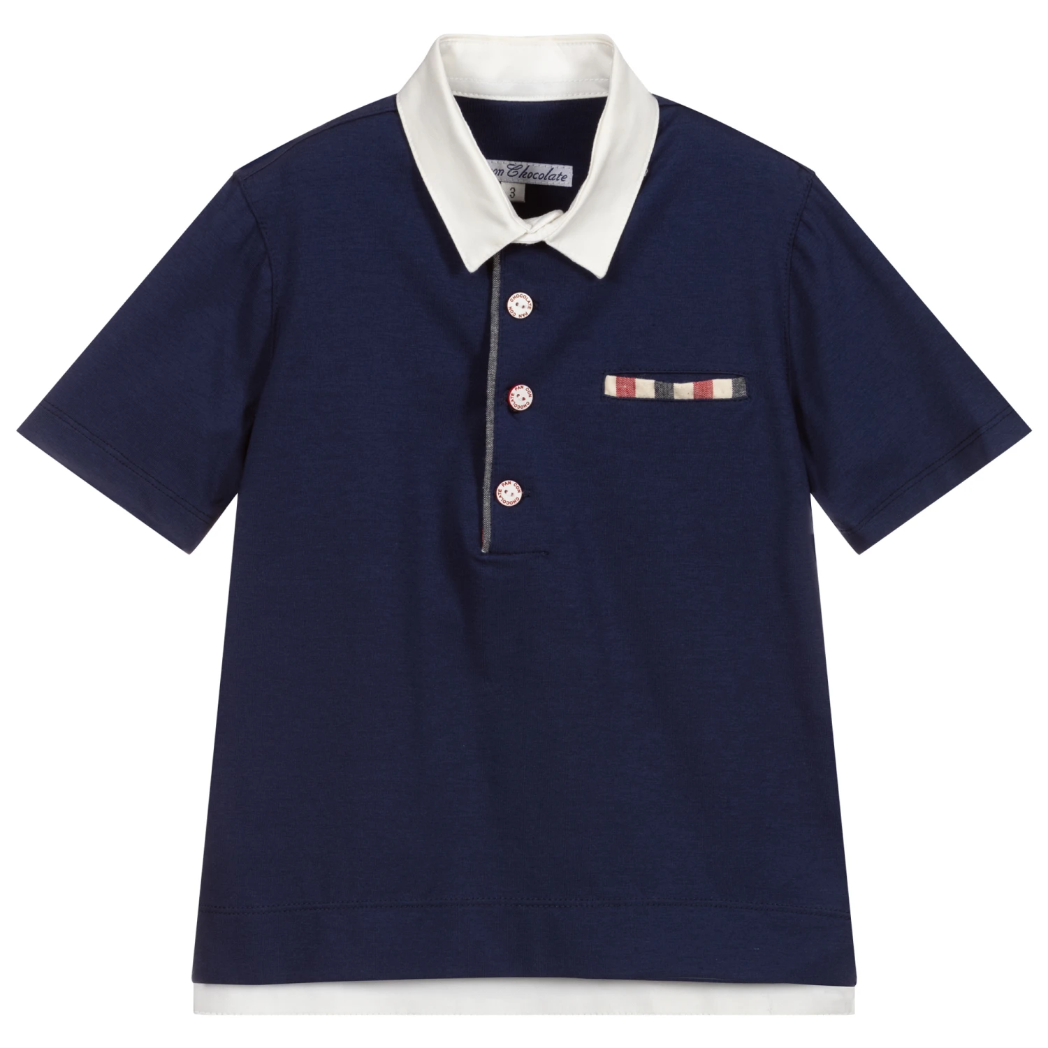 Boys navy blue polo shirt by Pan Con Chocolate, made from super soft and lightweight cotton jersey. It has an ivory collar and lovely red, ivory and navy blue striped trims on the button placket and chest pocket.