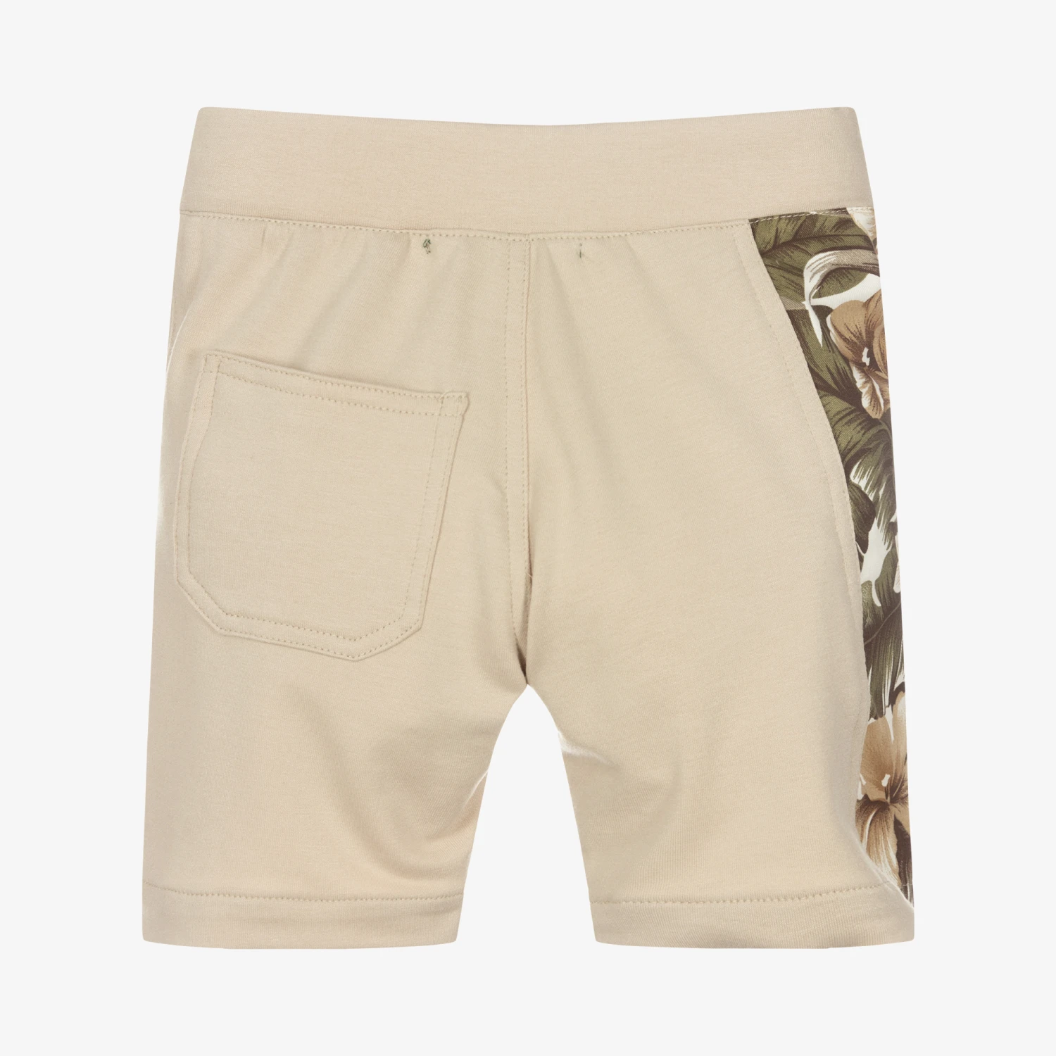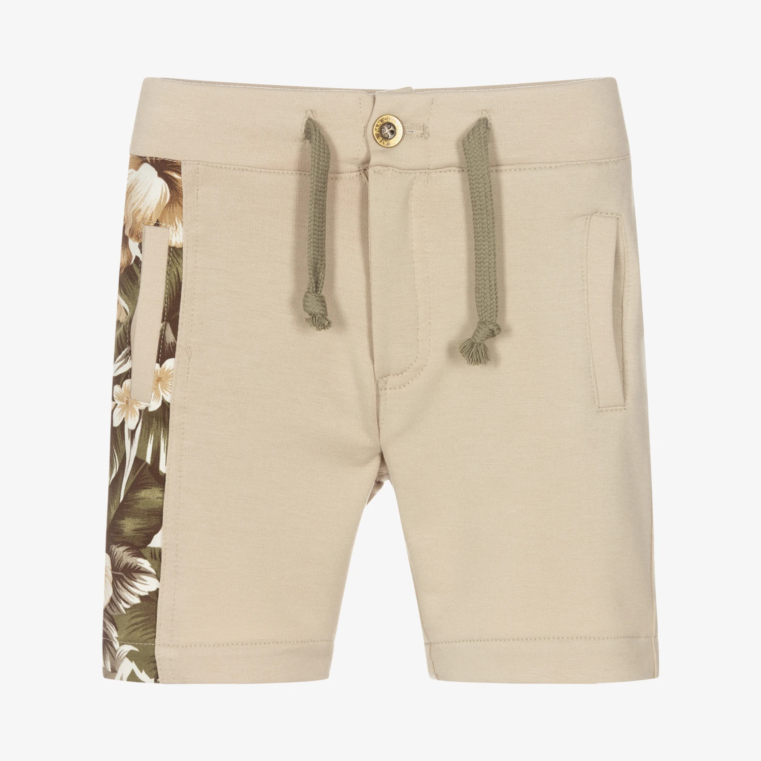 Casual beige shorts for boys by Pan Con Chocolate, made in soft and comfortable cotton jersey. They are trimmed with a stylish tropical floral print on one side, in khaki green and beige. There are useful front and back pockets, with a branded button and zip fastening, and a faux drawstring detail.