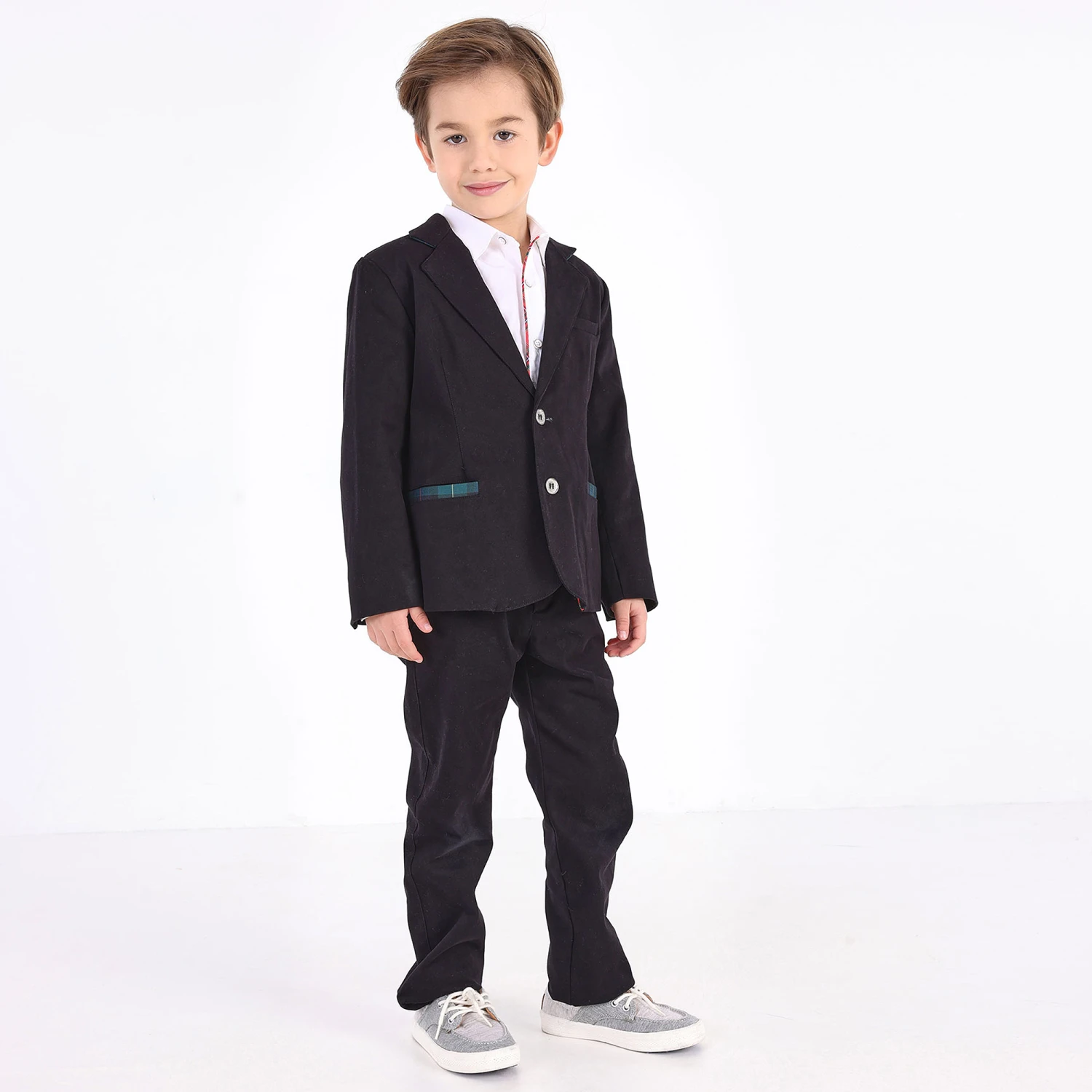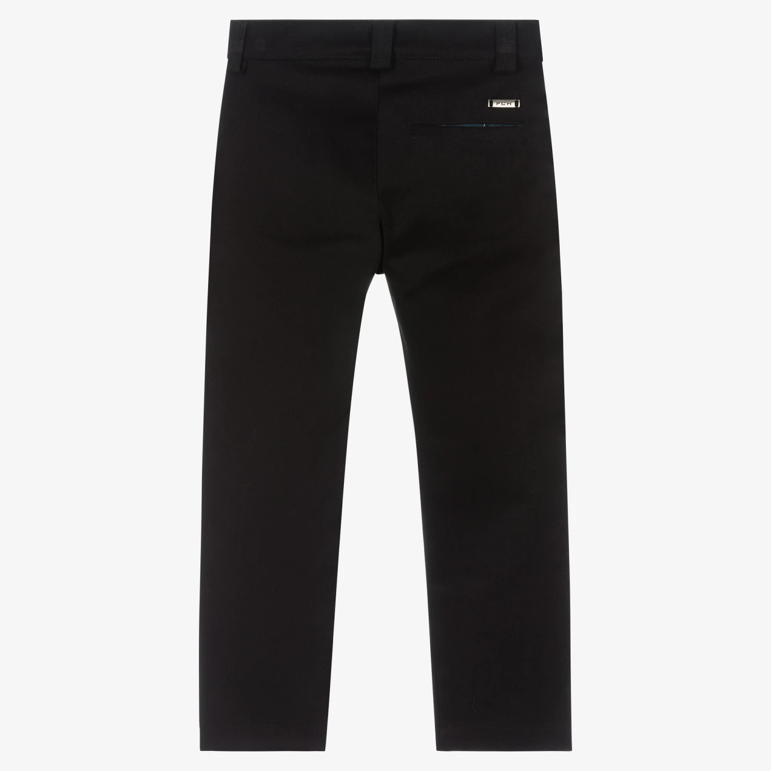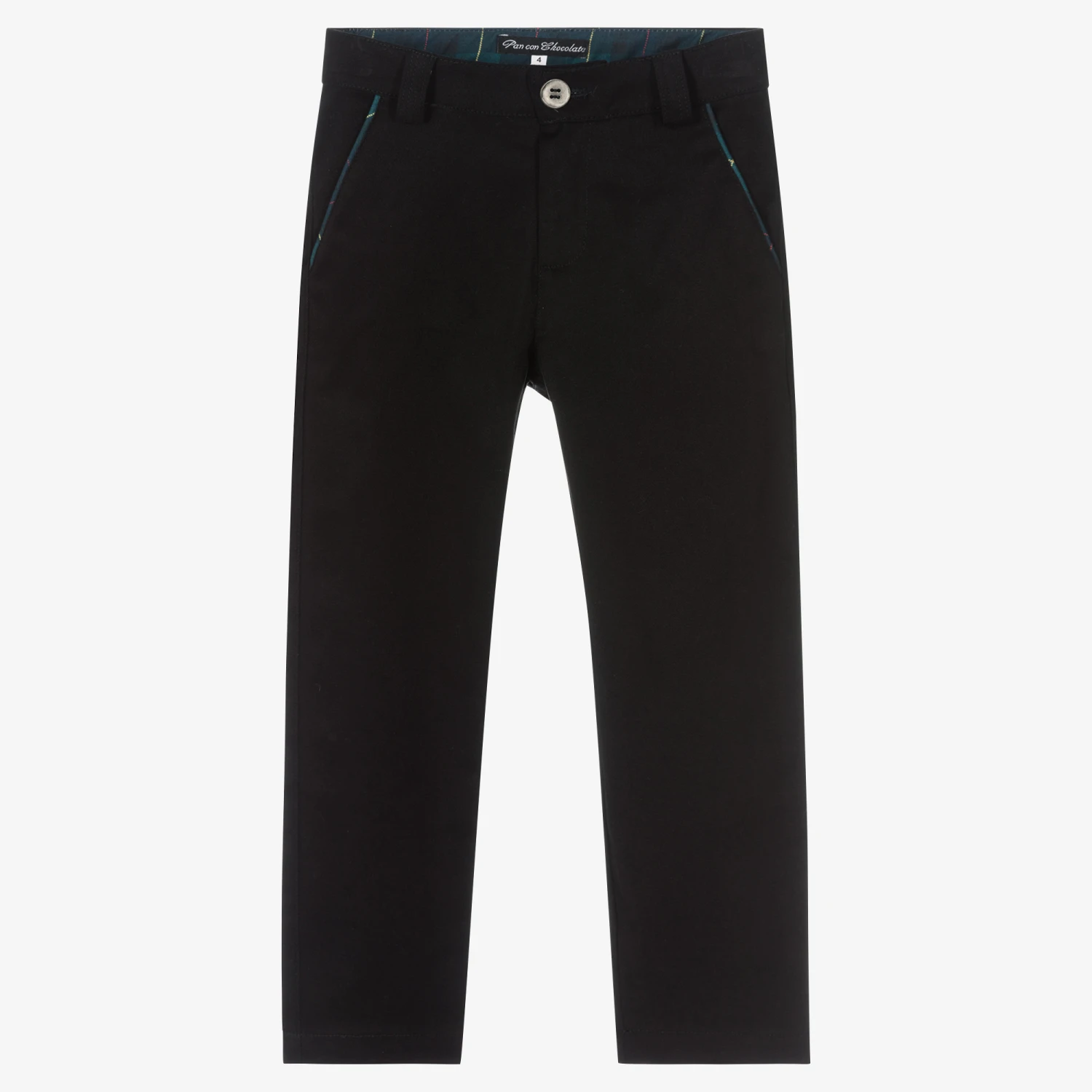 Smart casual black chinos for boys by Pan Con Chocolate, made in soft, mid-weight cotton twill. They have a useful adjustable waist and fasten on the front with a zip and button. There is green tartan piping on the pockets and a silver logo tab around the back.